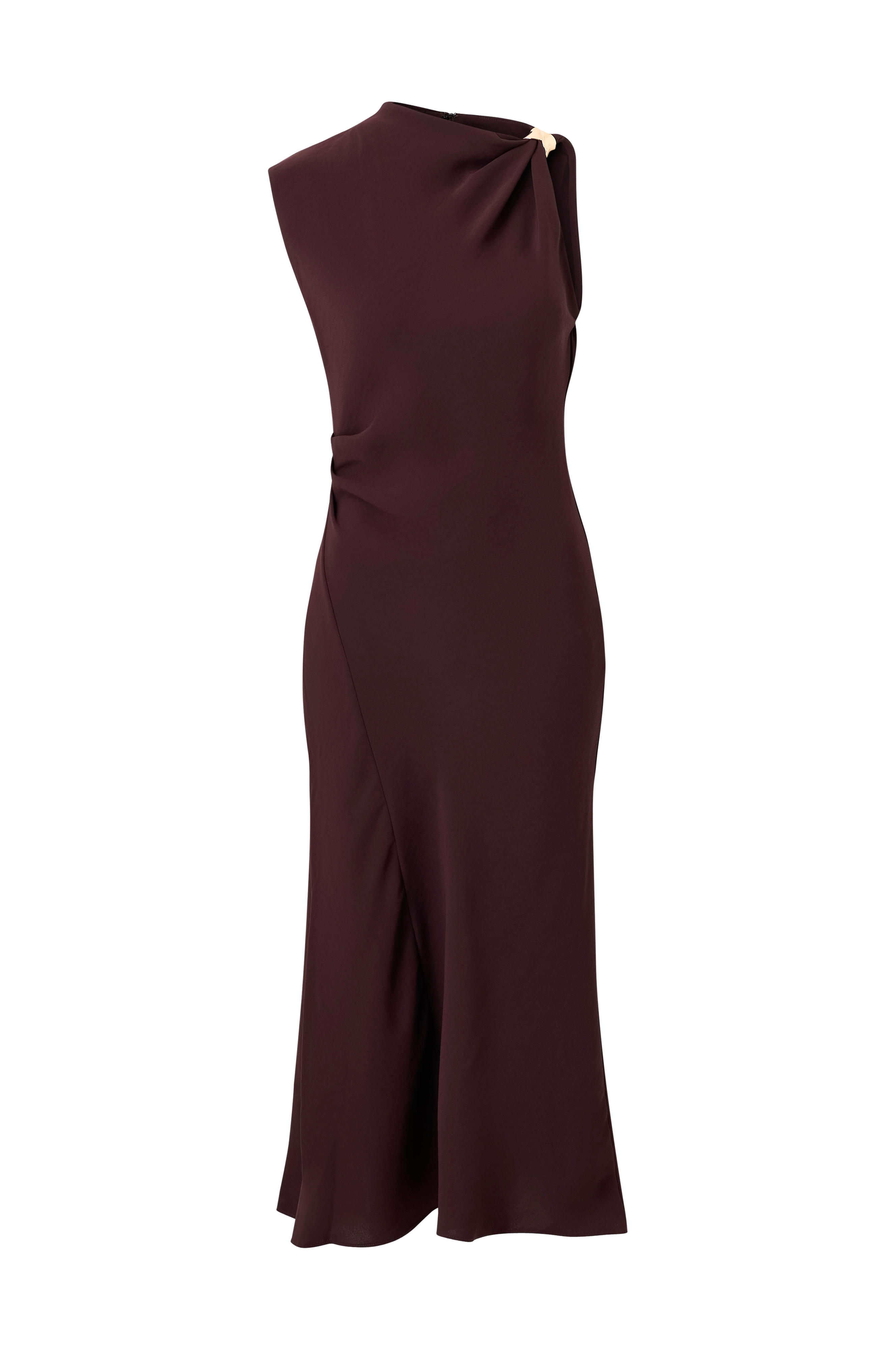 • Lang, ermløs kjole• Drapert hals med dekorativ, gullfarget spenne i ene siden• Glidelås i nakken• Drapering på midjen• Litt lengre bakside• Lengde: 131 cm i størrelse S