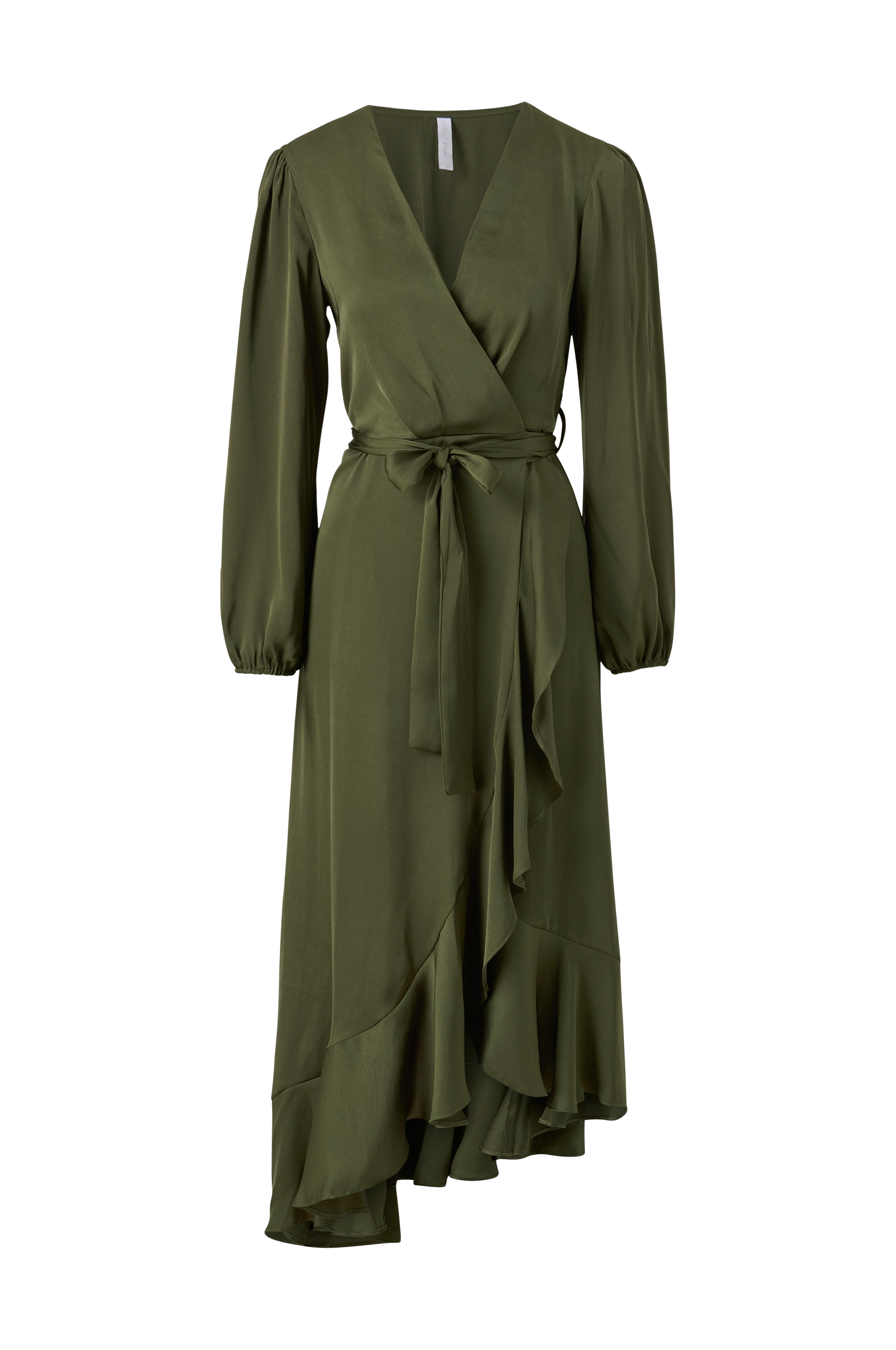 • Åpen omslagsmodell• Definert midje med knytbar tråd• Langt, bredt erme med elastisk strikk i ermeslutten• Volang i nedre kant• Lengde: 132 cm i størrelse S