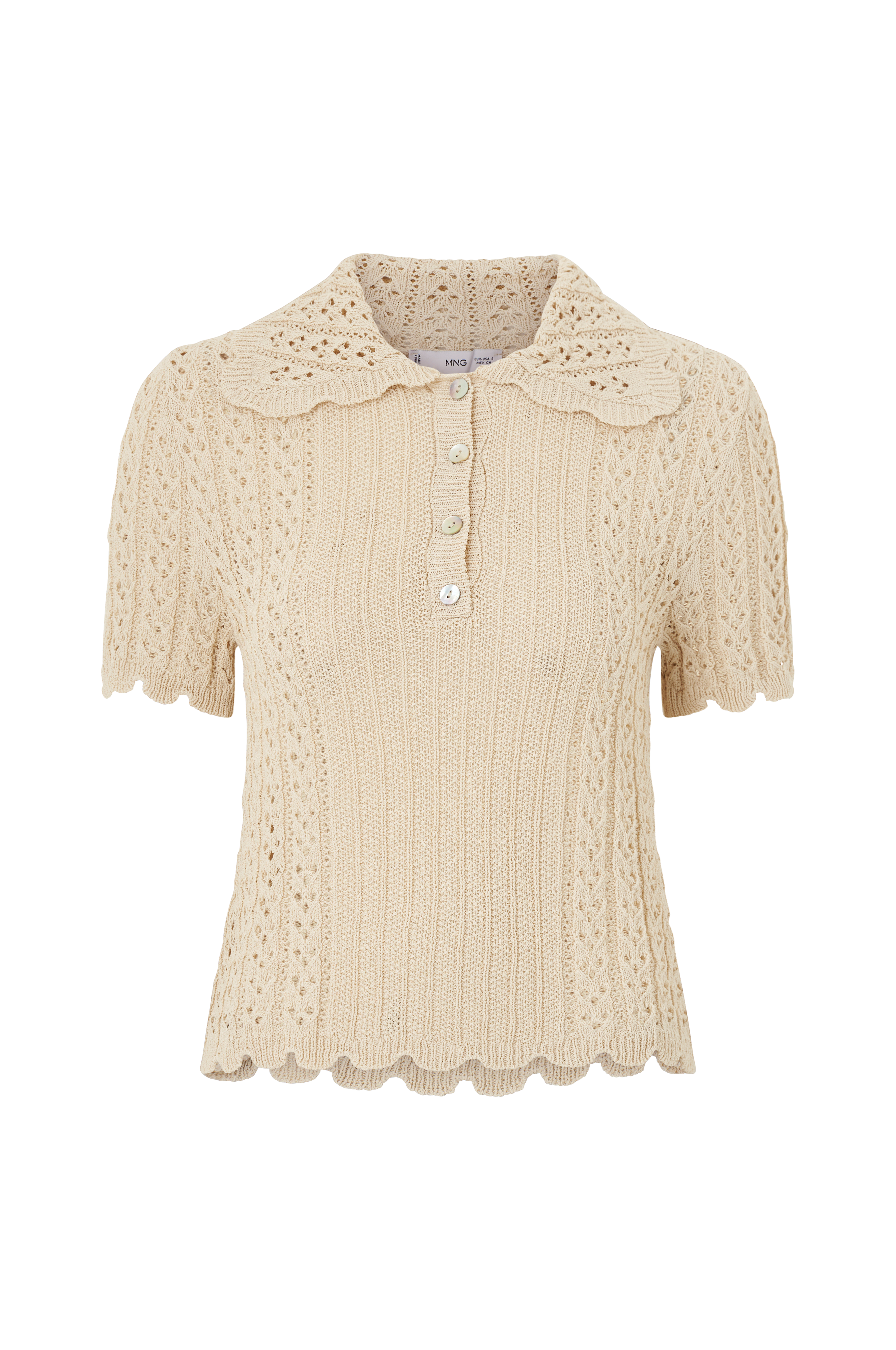 • Mønsterstrikket modell• Stor krage• Kort frontknepping• Bølgede, ribbestrikkede kanter