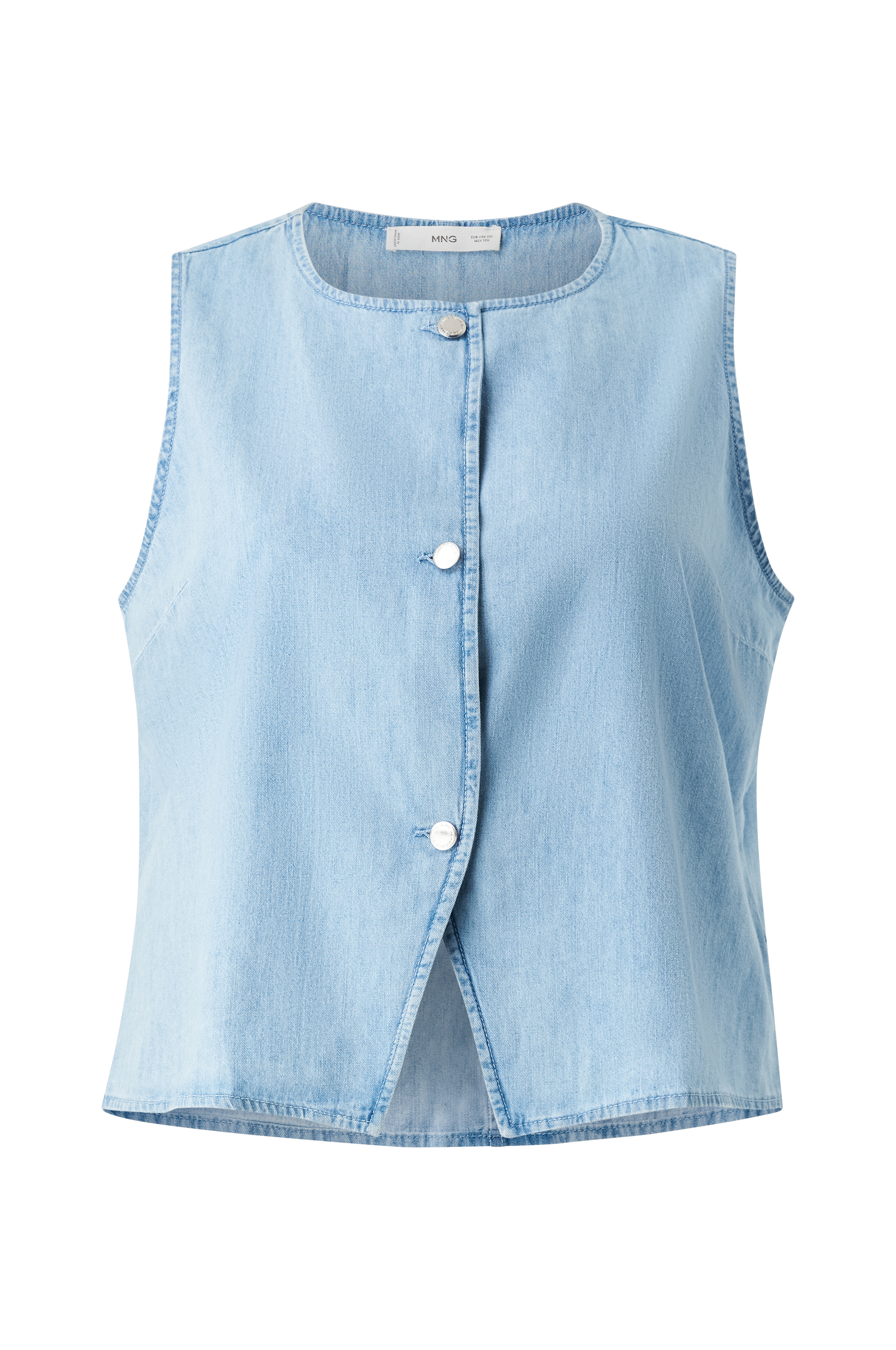 • Ermløs topp i denim• Rund hals• Knappstolpe hele veien fram• Plusstørrelser