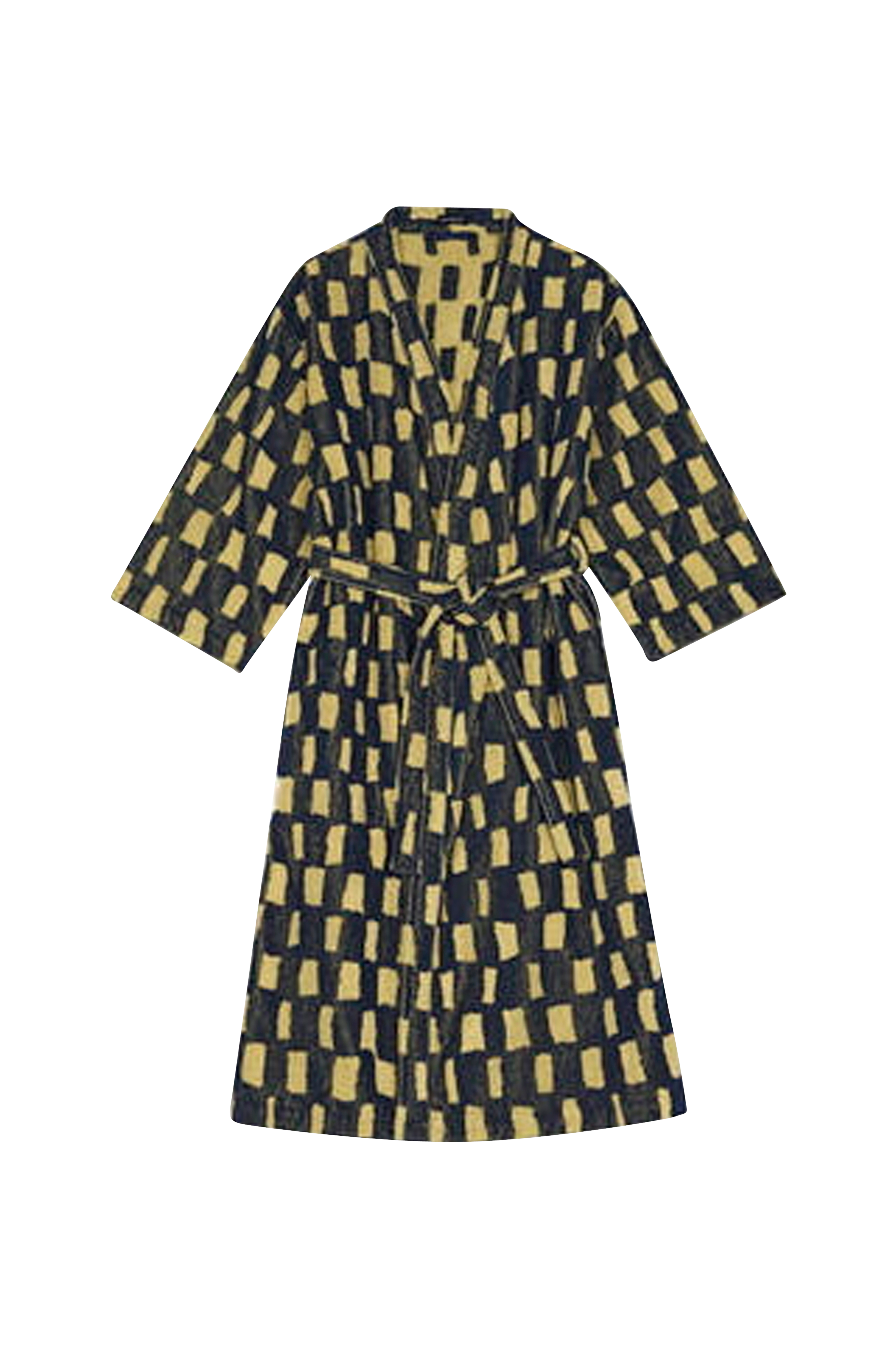 Badekåpe i bomullsfrotté med mønsteret Iso Noppa. Badekåpe har store lommer foran og et avtagbart belte. Mønsteret Noppa - designet av Vuokko Eskolin-Nurmesniemi som jobbet på Marimekko fra 1953 til 1960 - representerer tidløs Marimekko-design til fulle. Rytmiske Noppas (terning) rutedesign er et av hennes mønstre som har beholdt sin popularitet tiår etter tiår.