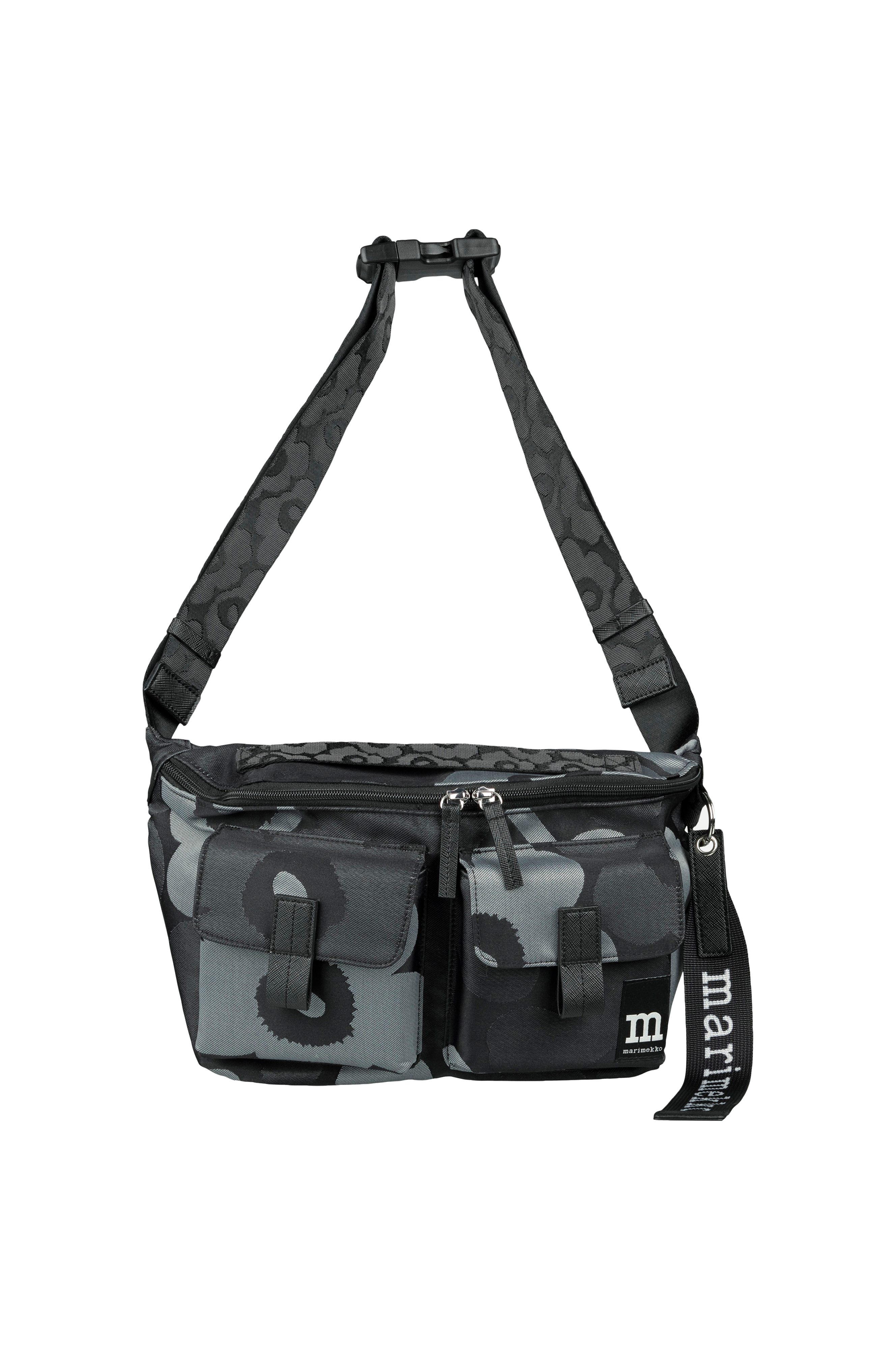 Sling Bag M crossbody har det jacquardstrikkede Unikko -mønsteret. bag har glidelåslukking, et håndtak og en justerbar skulderrem med spenne, begge med det jacquardstrikkede Unikko -mønsteret. Det er to klafflommer foran med magnetisk lukking, en glidelåslomme på innsiden og en utvendig baklomme som lukkes med en magnetisk knapp. Marimekko-nøkkelringen er festet på forsiden.