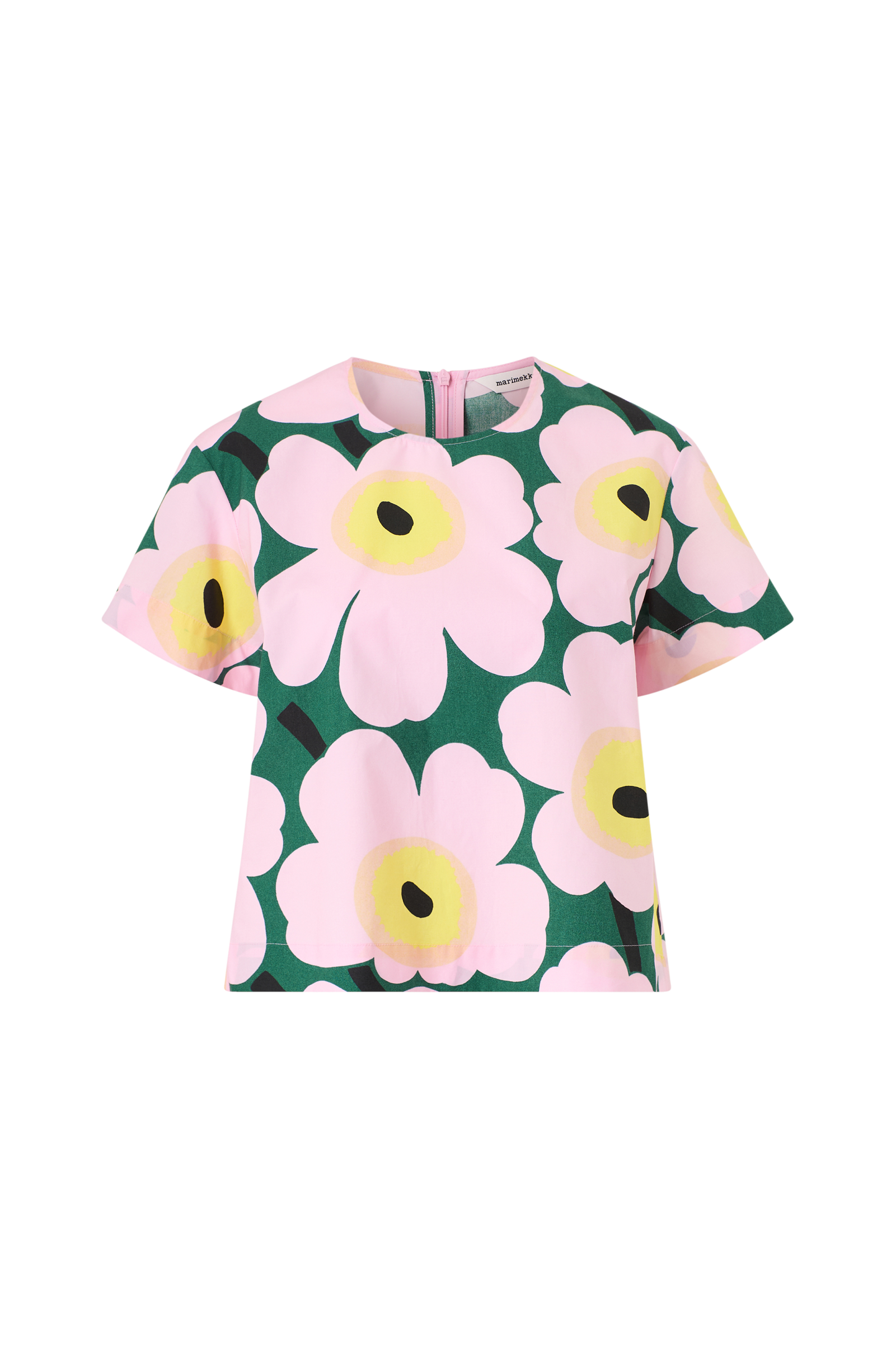 Huojunta blusen har en avslappet, A-linjeformet passform og er trykt i Helsinki med mønsteret Unikko. Blusen har O-hals med skjult glidelås i baksømmen og korte, løse ermer.