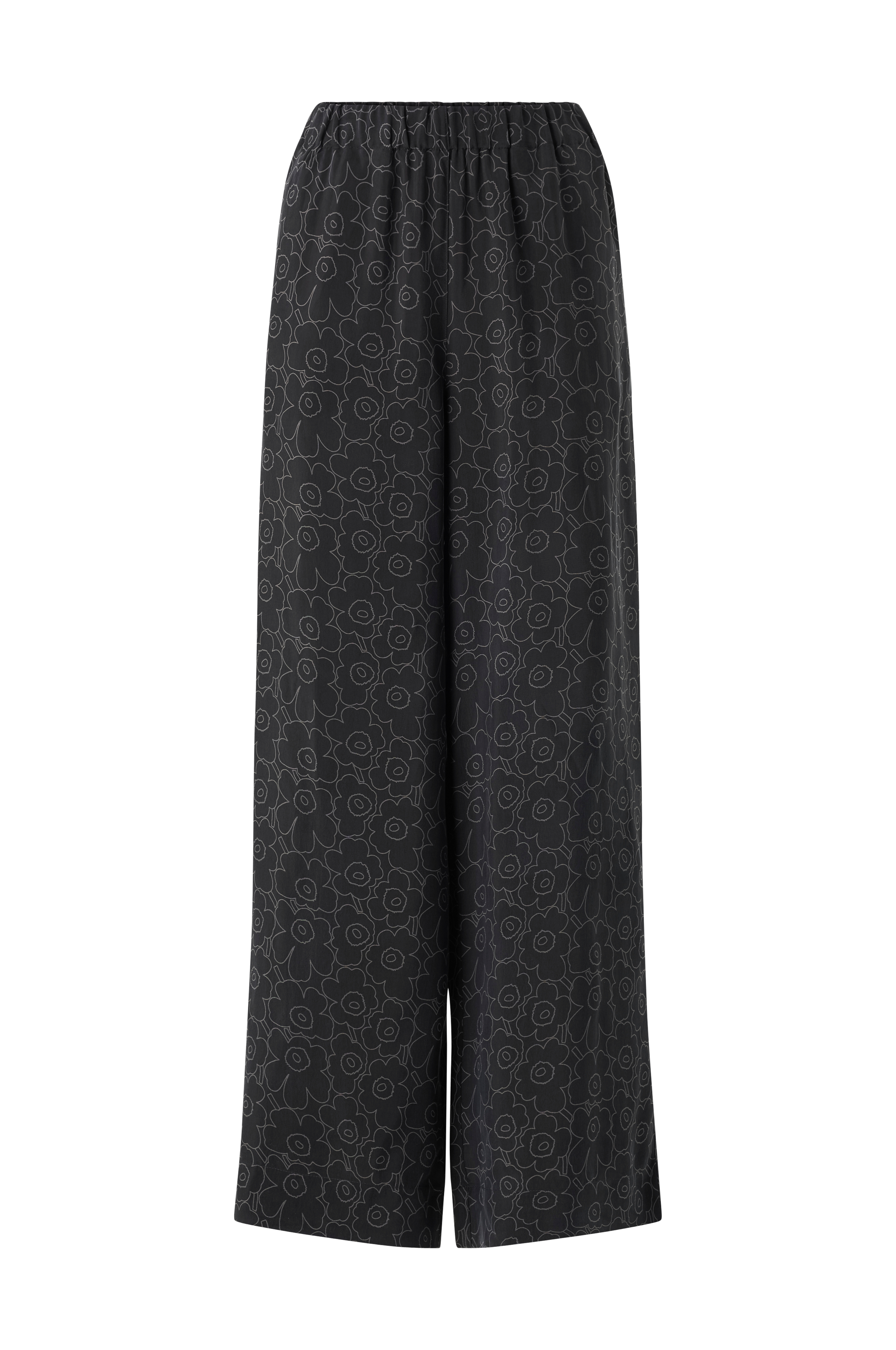 Oanet cuprobuksen har en avslappet passform og lange, vide bukseben, og den er designet med Mini Unikko -mønsteret. Buksen har elastisk linning og lommer i sidesømmen.