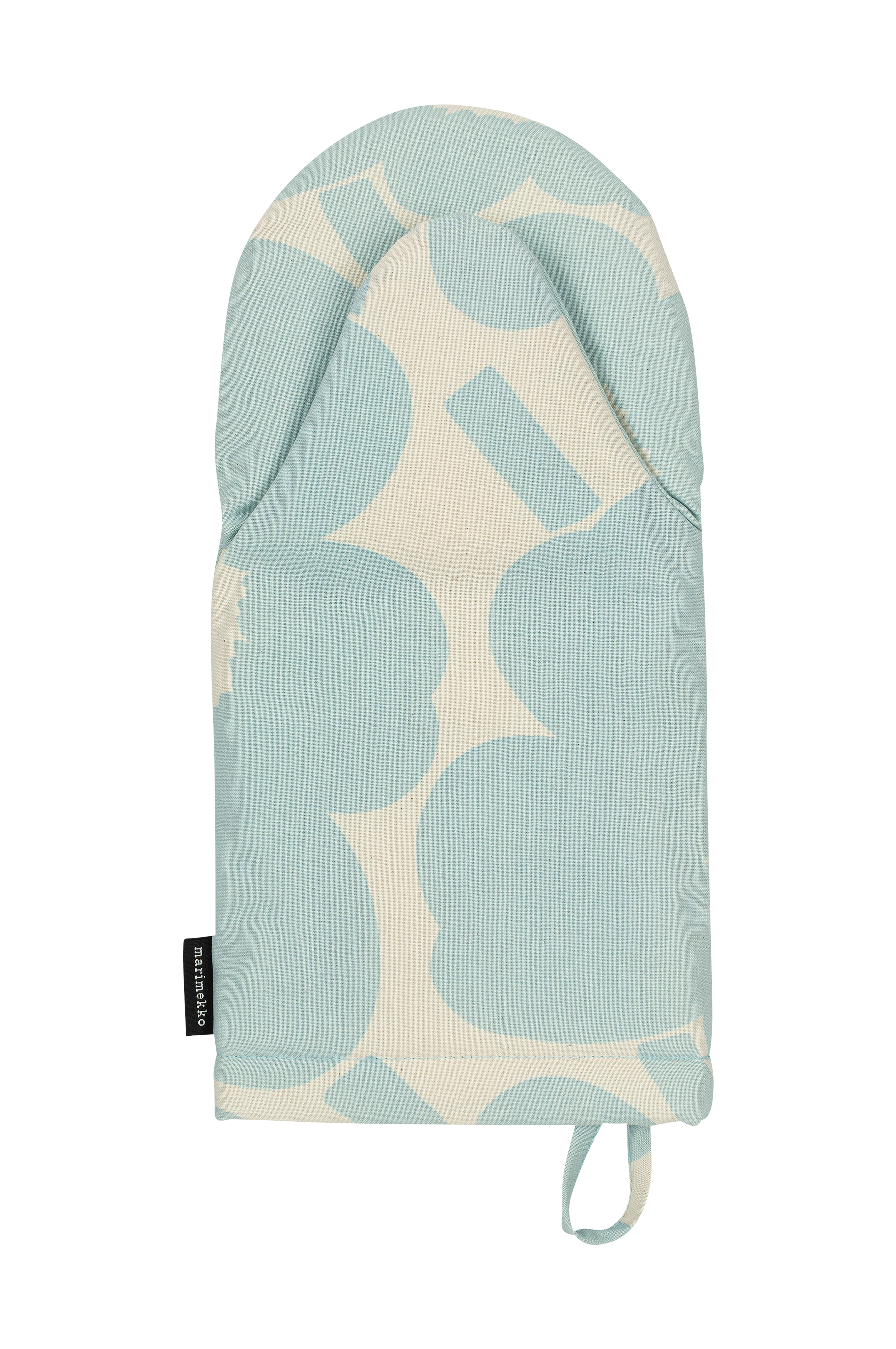 Grytevott av ubleket bomull med mønsteret Pieni Unikko. Trykt i Helsingfors. Grytevotten er vattert og har opphengsløkke. Dette produktet er fremstilt av stoff som er trykt med naturlig indigoblå farge, et plantebasert fargestoff utvunnet fra planten vaid i Finland. Fargen kan blekne noe ved de første vaskene og etter bruk. Marimekkos berømte valmuemønster Unikko ble designet i 1964 i en periode da abstrakte mønstre gikk igjen i kolleksjonene. Designeren Maija Isola ville skape noe interessant i dette organiske temaet, og designet en rekke ulike blomstermønstre. I dag symboliserer det ikoniske blomstermotivet kreativitet.