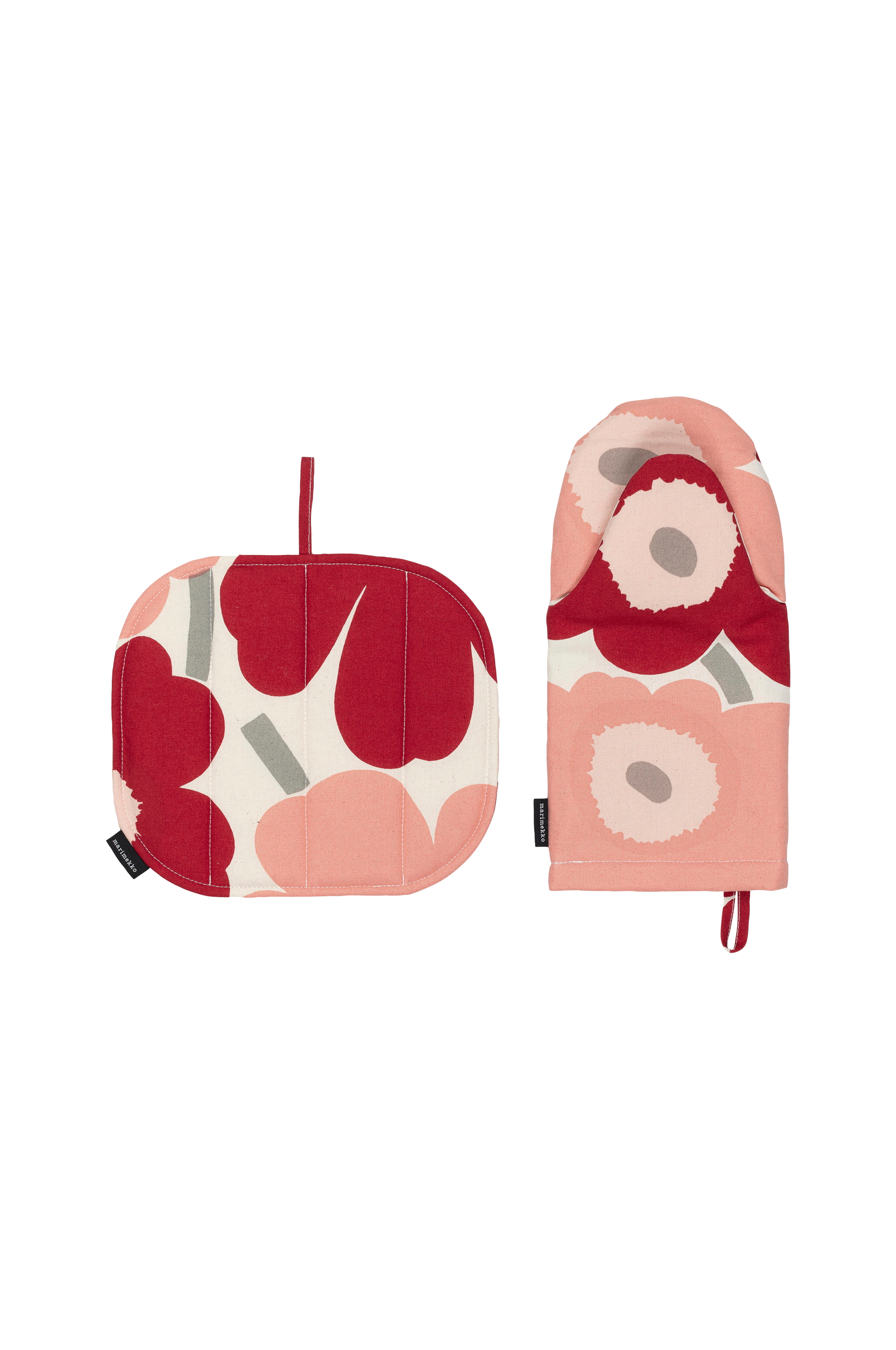 Pieni Unikko mønstret kjøkkentekstilsett inneholder en grytevott og en gryteklut. Begge produktene er laget av ubleket bomull, som er trykt i Helsinki, og de har vattert fyll og opphengsstropper. Ubleket bomullsstoff har en naturlig livlig farge og overflate, der det kan forekomme små mørke prikker som stammer fra bomullsplanten. Det kan være forskjeller mellom produktene når det gjelder denne egenskapen. Unikko ble skapt av Maija Isola i 1964 og har siden den gang blitt et internasjonalt ikon for grafisk design. Grunnleggeren av Marimekko, Armi Ratia, mente at det ikke var mulig å fange den sanne essensen av ekte blomster på trykk, og derfor ble blomstertrykk tidligere ekskludert fra Marimekkos kolleksjoner. Maija Isola designet derfor Unikko som en abstraksjon av en blomst i stedet for en fotorealistisk gjengivelse. I dag er Unikko et kraftfullt symbol på glede og kreativitet, sømløst integrert i Marimekkos designidentitet.