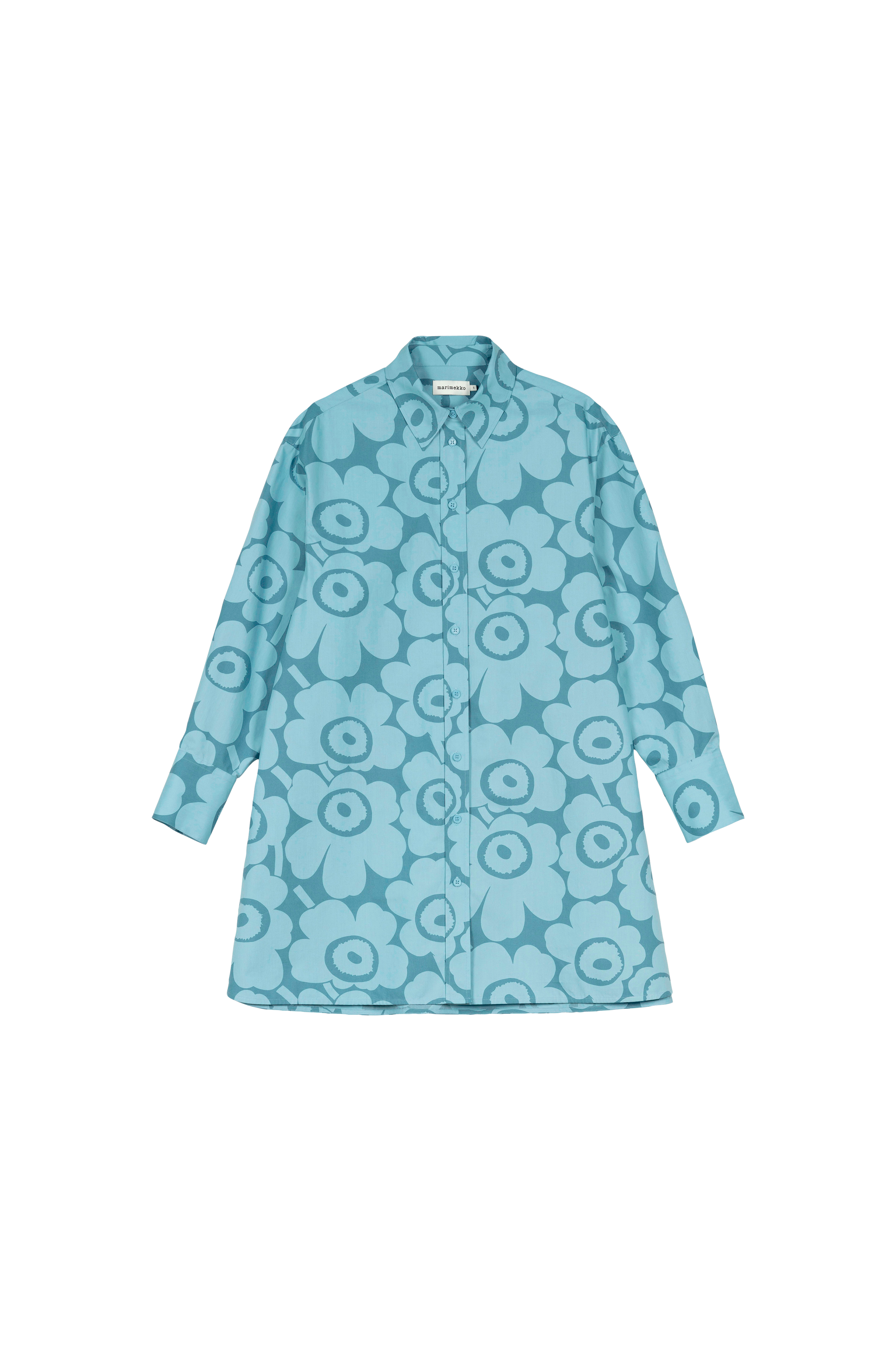Skjortekjolen Kuvitelma har en oversized, A-formet passform og er trykt i Unikko -mønsteret. Kjolen har en spiss krage, knappelukking, bæresøm og en fold i ryggen. Ermene har plisseringer, slisser og knappelukking i mansjettene. Fållen har et buet snitt og trekantede sidepaneler.