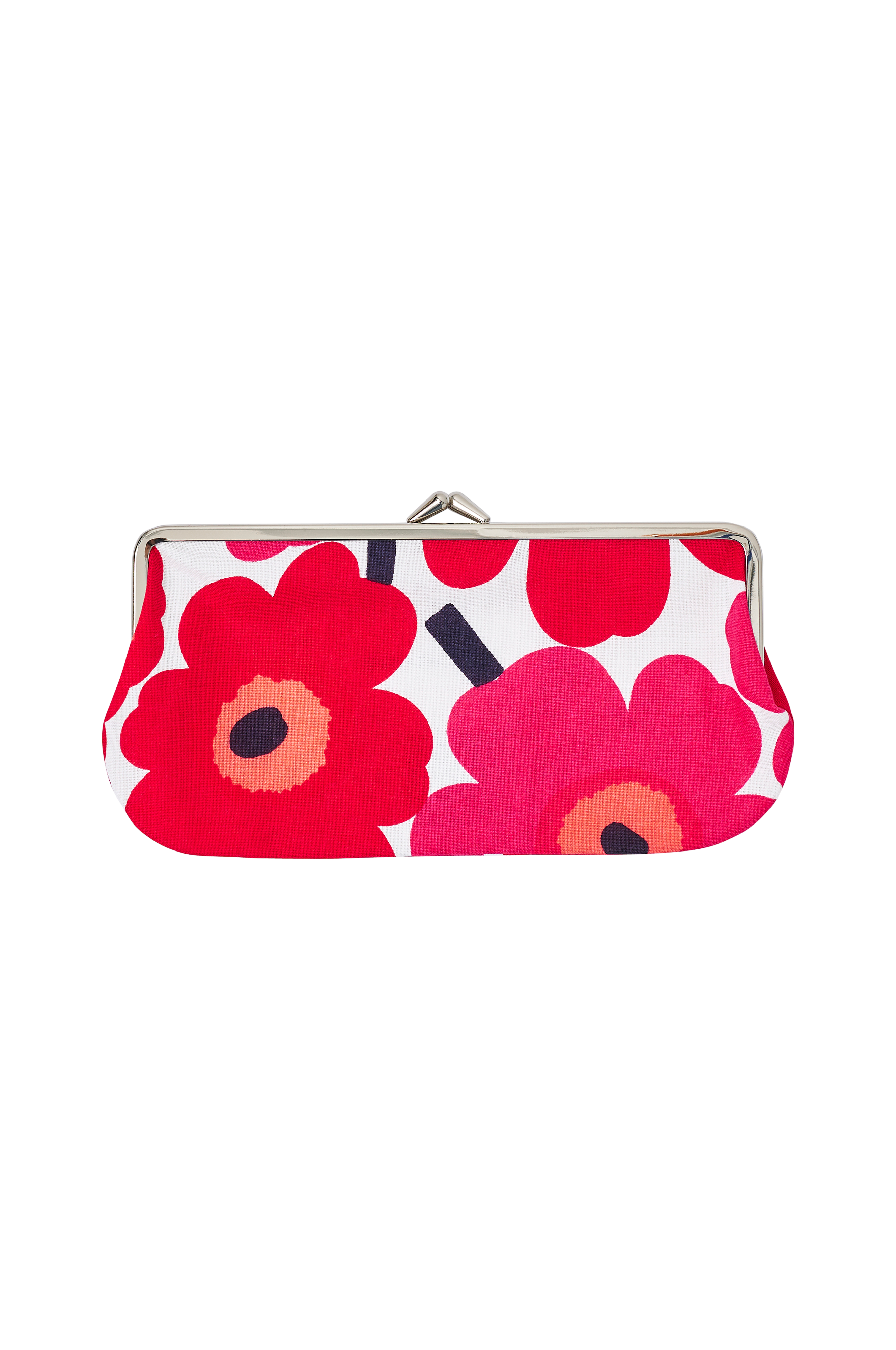 Allsidig klassiker fra Marimekko som kan brukes både som portemone, pennal eller konvoluttveske. Produsert i bomullsstoff. Ramme i metall med knepplås. Bredde 11 cm, høyde 9 cm.