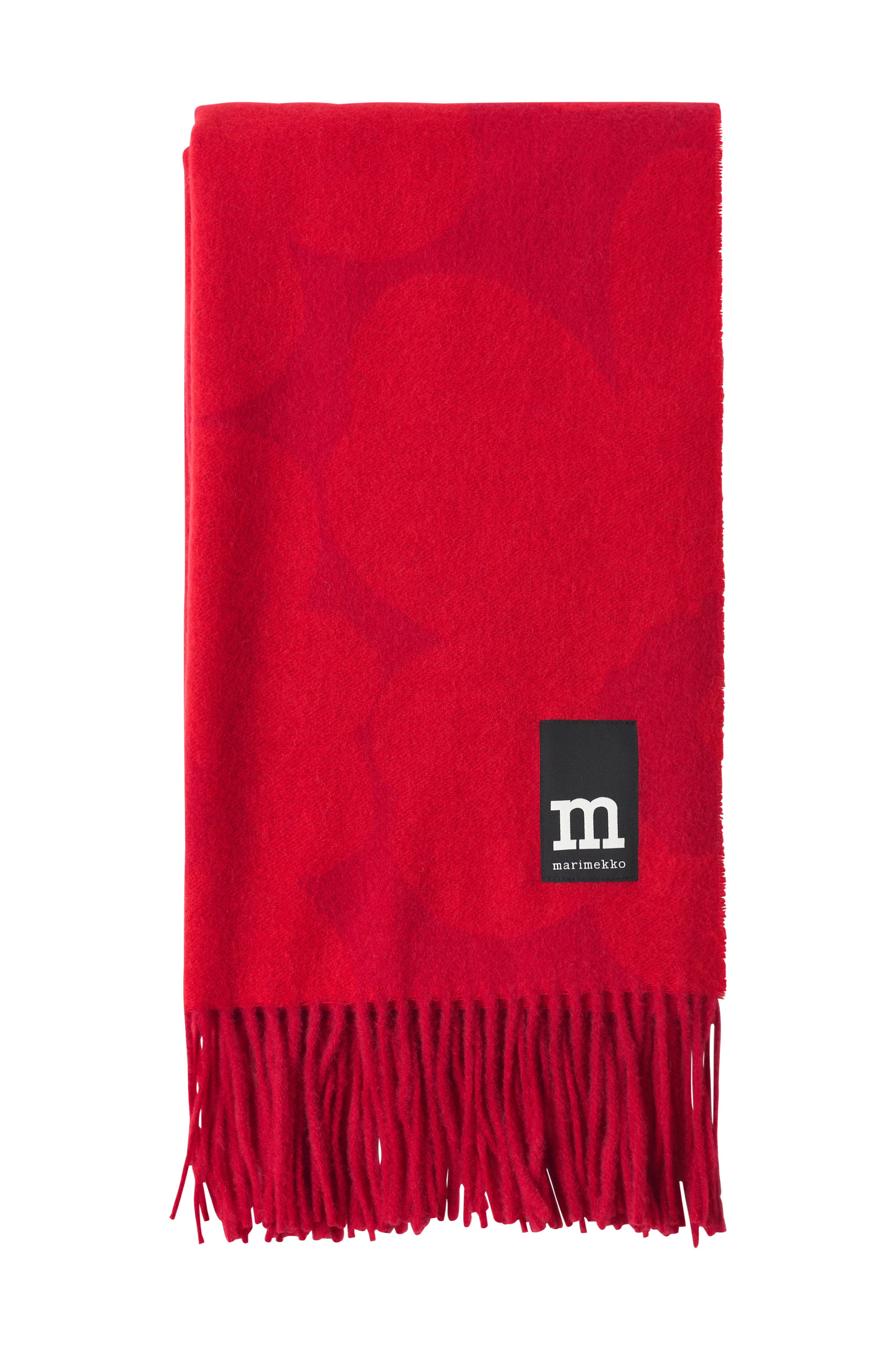 Det lange skjerfet har frynser i endene og er merket med Marimekko-merket.