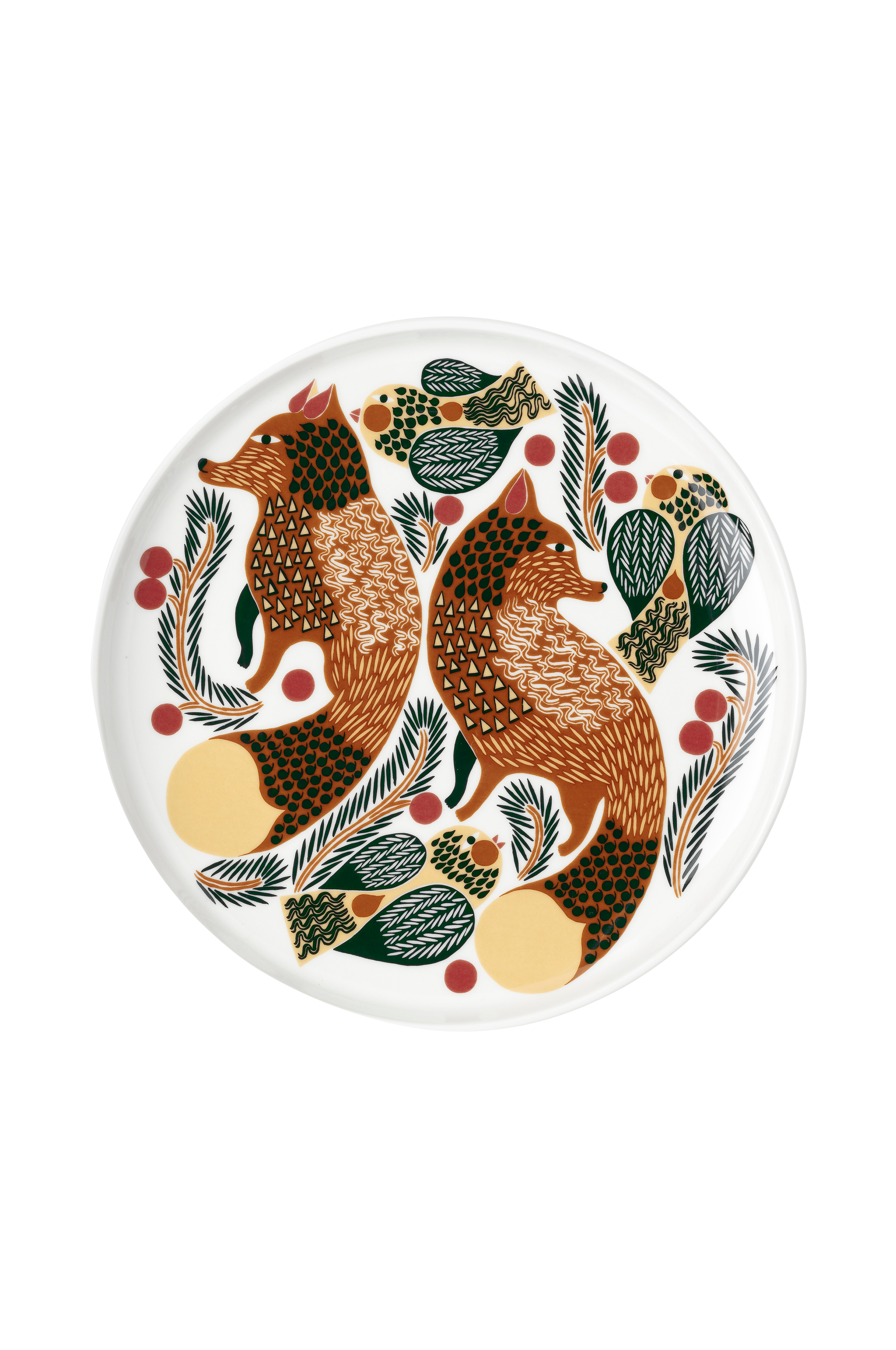 Tallerkenen Oiva er av hvitt steintøy som tåler oppvaskmaskin, ovn, mikrobølgeovn og fryser. Mønsteret Ketunmarja (melbær) utstråler mystisk henførelse, og forestiller rever som har smøget seg inn i en hage ved skumringen og små fugler i en barlind.