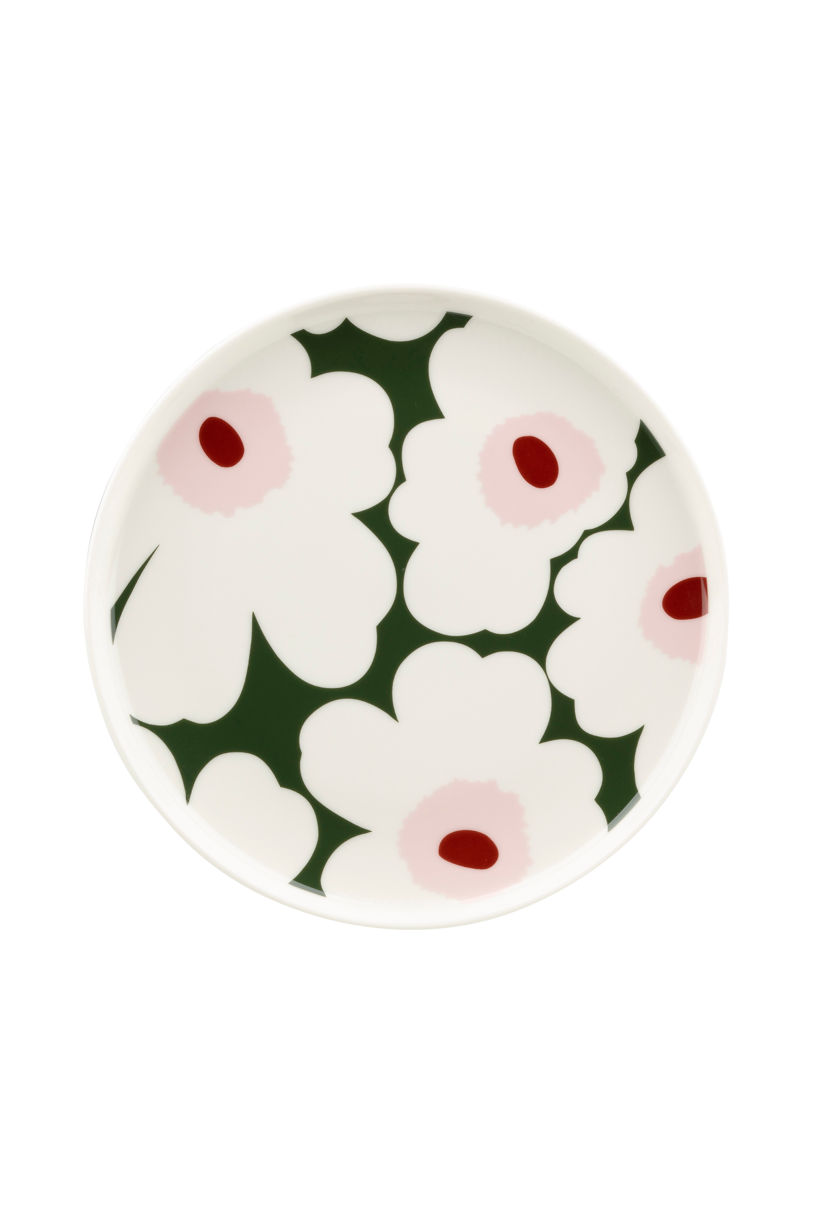 Oiva-tallerkenen med Unikko mønster er laget av hvitt servise som tåler oppvaskmaskin, stekeovn, mikrobølgeovn og fryser. Fjern klistremerket fra undersiden av produktet før bruk. Klistremerket inneholder en liten mengde metall. Marimekkos berømte mønster Unikko ble født i 1964, i en tid da designhusets kolleksjoner for det meste inneholdt abstrakte trykk. Designeren Maija Isola ønsket å skape noe interessant ut fra dette organiske temaet og designet en hel serie med blomstertrykk. I dag representerer den ikoniske blomsten kreativitet. 20 cm