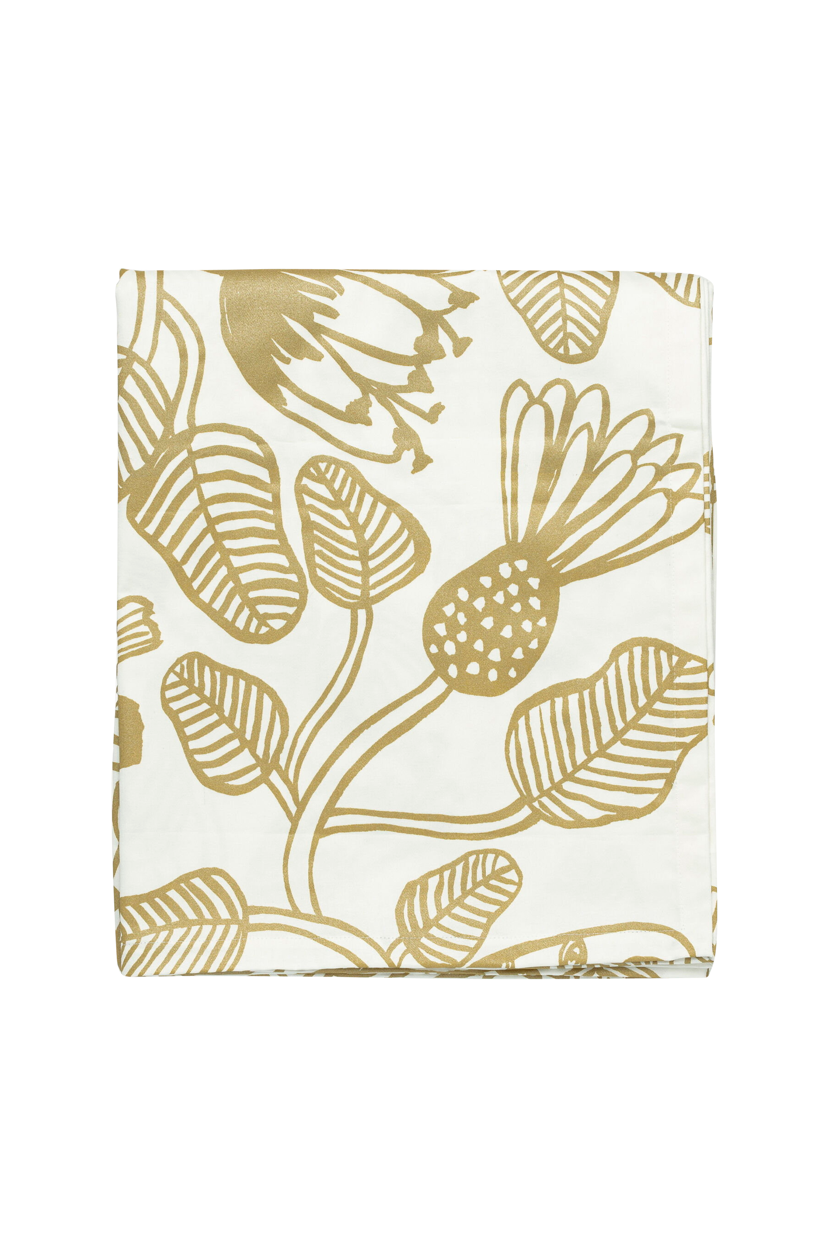 Denne duken har det gylne metallpigmentet Tiara, som er trykt i Helsinki. Duken er laget av 100 % økologisk bomullssatin. I det sprudlende Tiara -mønsteret, designet av Erja Hirvi, er ulike typer planter og blomster avbildet som naturens krone på verket.