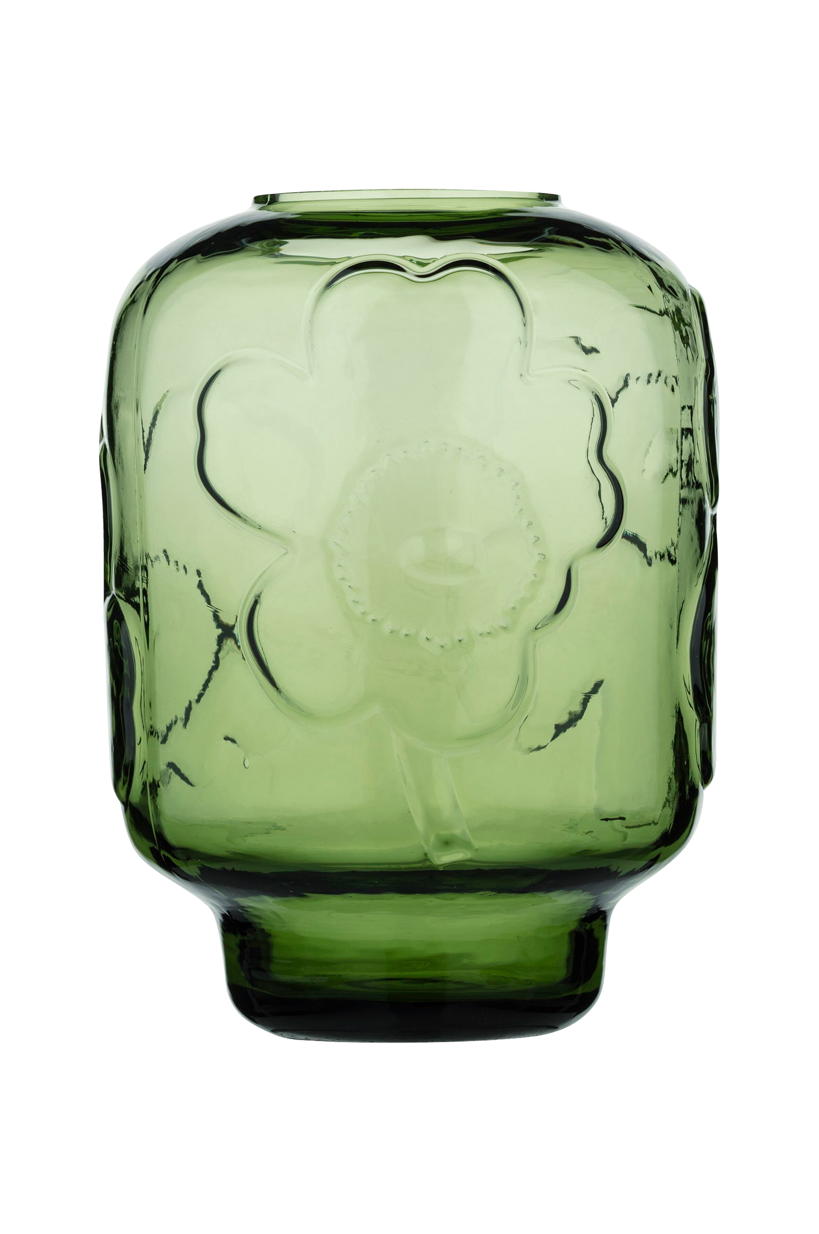 Denne glass vase har det pregede Unikko -mønsteret. Vi anbefaler at vase vaskes for hånd. Dette produktet er laget av klar, munnblåst glass. Dette produktet er pakket i en eske med Marimekko Logo-mønster. Marimekkos glassvarer er munnblåst i en form. Siden de er laget for hånd, kan de inneholde små tegn på håndverksmessig utførelse. Små variasjoner mellom produktene er naturlig. Det anbefales å vaske for hånd.