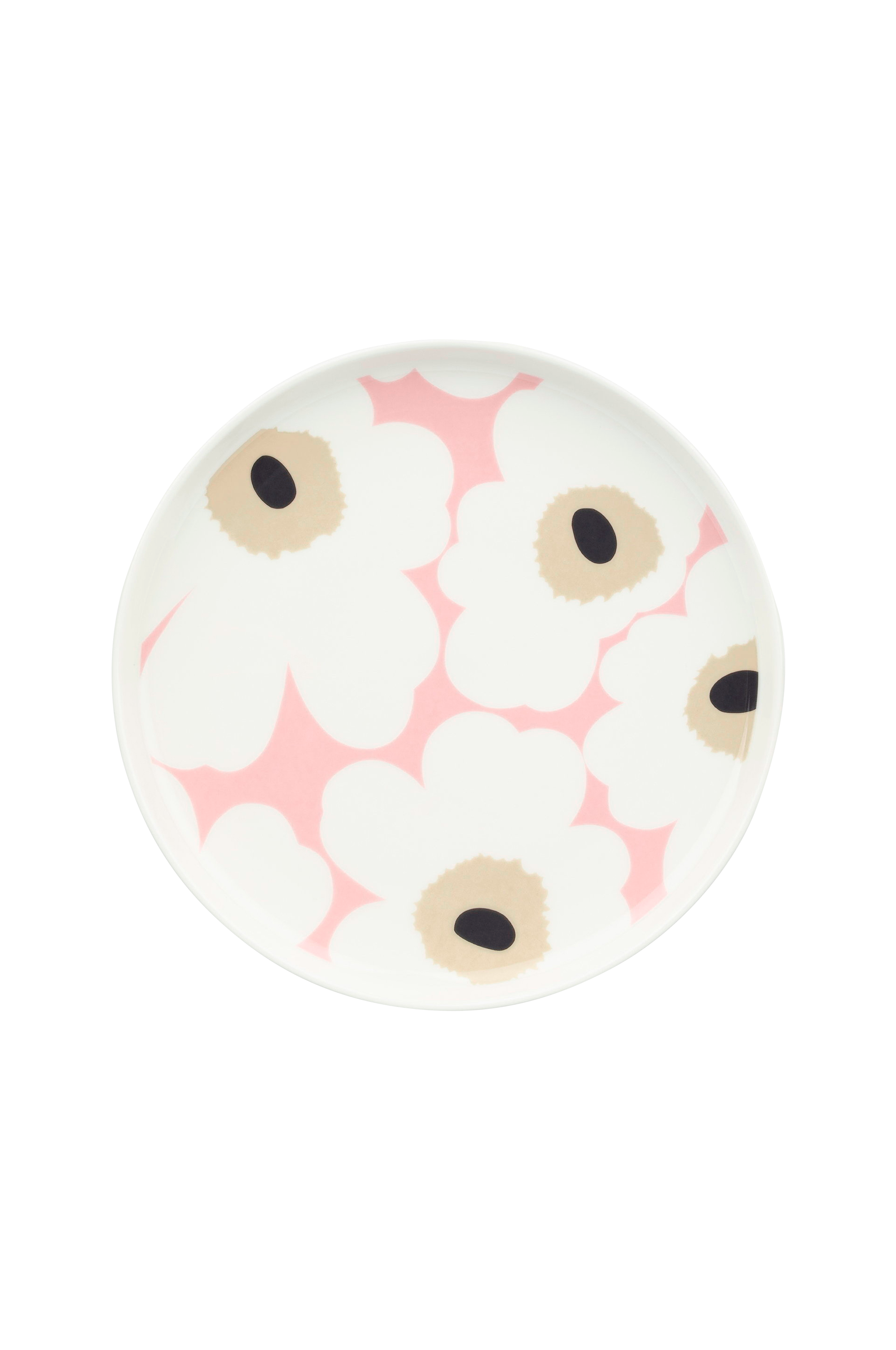 Oiva plate med Unikko mønster er laget av hvitt servise som tåler oppvaskmaskin, stekeovn, mikrobølgeovn og fryser.