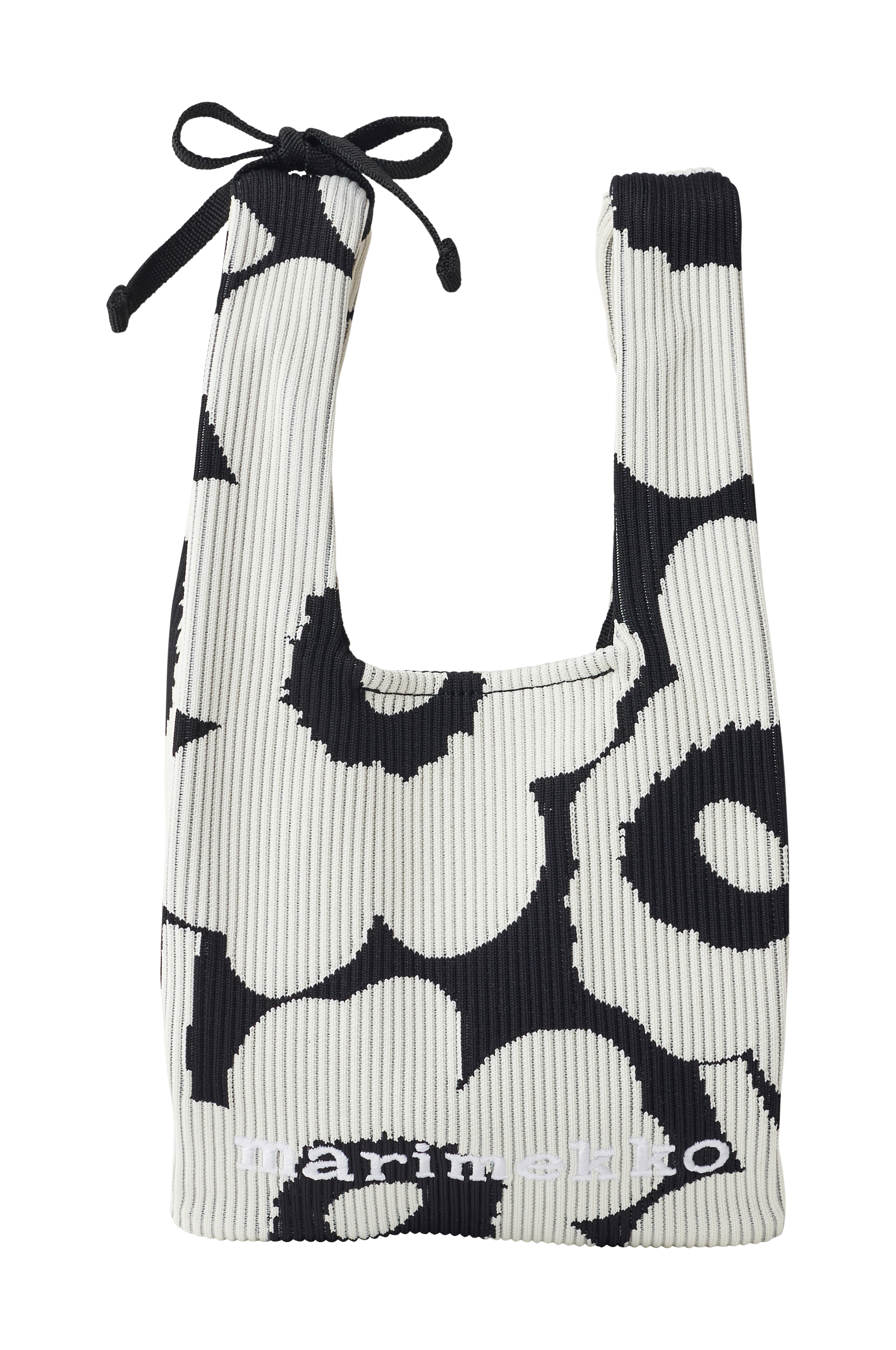 Vesken Knitted Mini Tote har det jacquardstrikkede Unikko -mønsteret med ribbestrikket look. Den lille vesken har håndtak og har den broderte Marimekko-logoen på forsiden.
