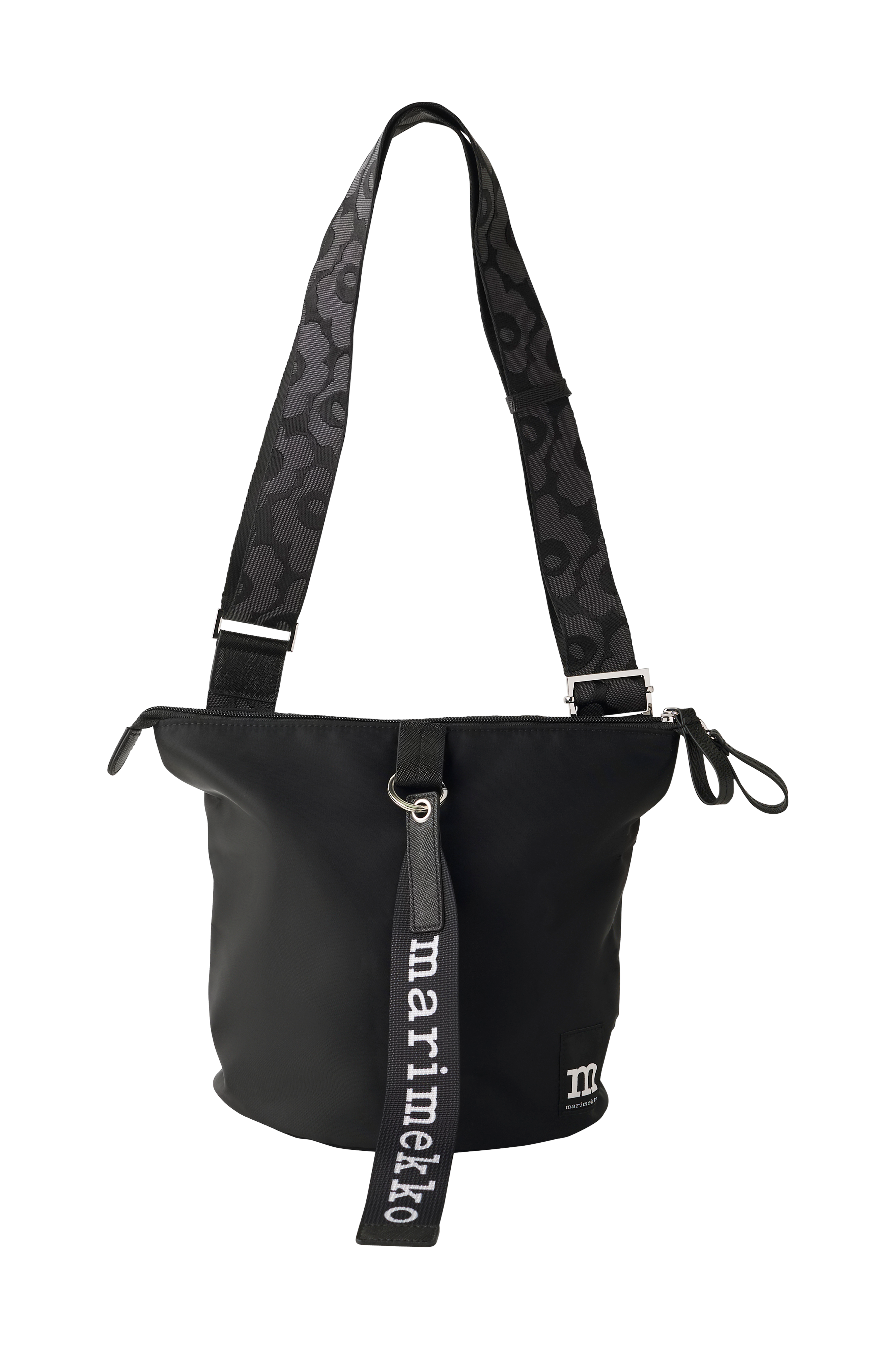 Carry All skulderveske med glidelåslukking, håndtak og en justerbar skulderrem i jacquardstrikket Unikko mønster. Det er en åpen lomme på innsiden og en åpen lomme på utsiden som lukkes med en magnetisk knapp. Marimekko-nøkkelringen er festet på forsiden.
