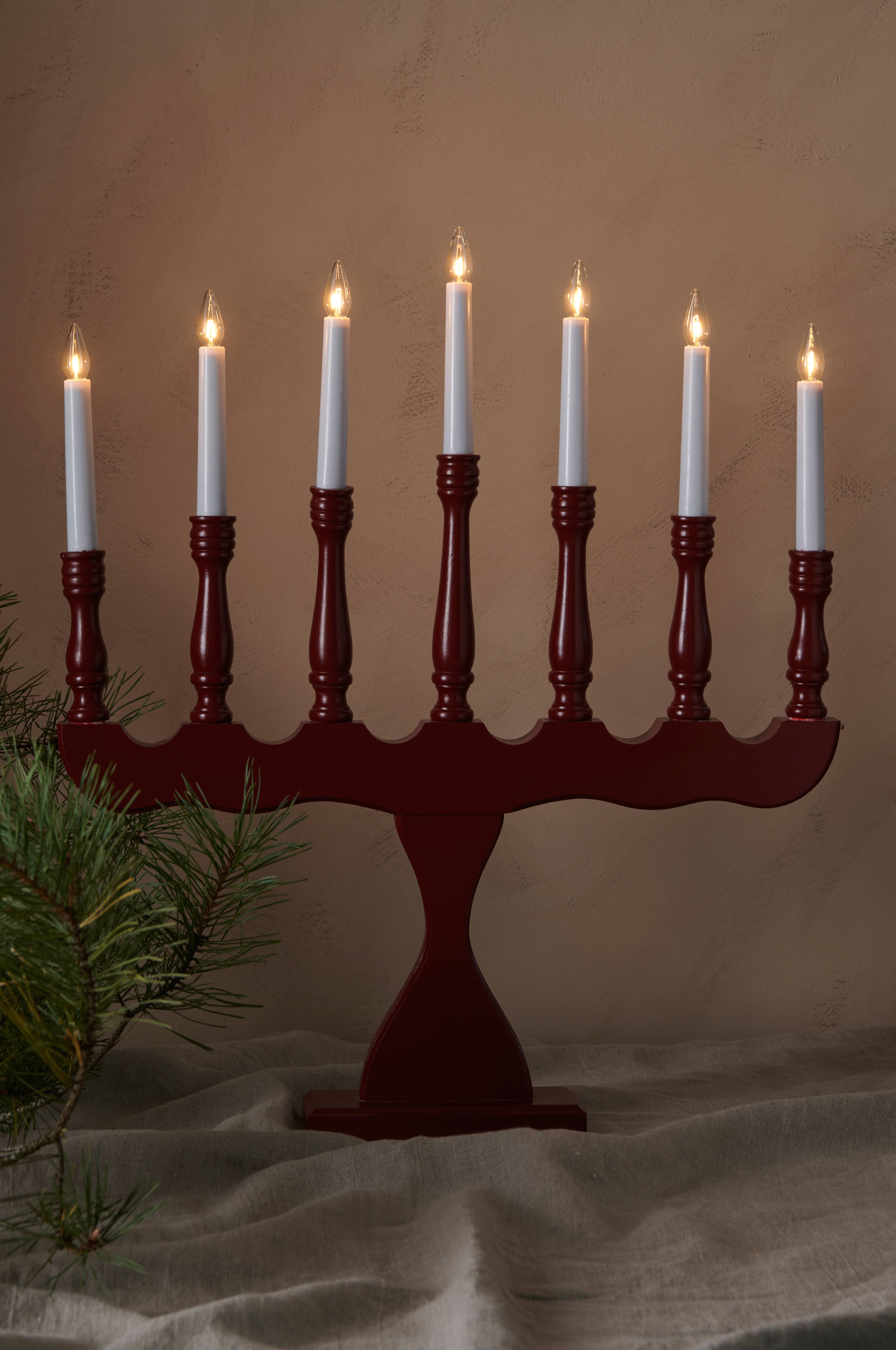 Lysestake i malt tre med 7 lys. Hvit ledning med strømbryter og støpsel. 7xE10. Lyspærer inkludert.