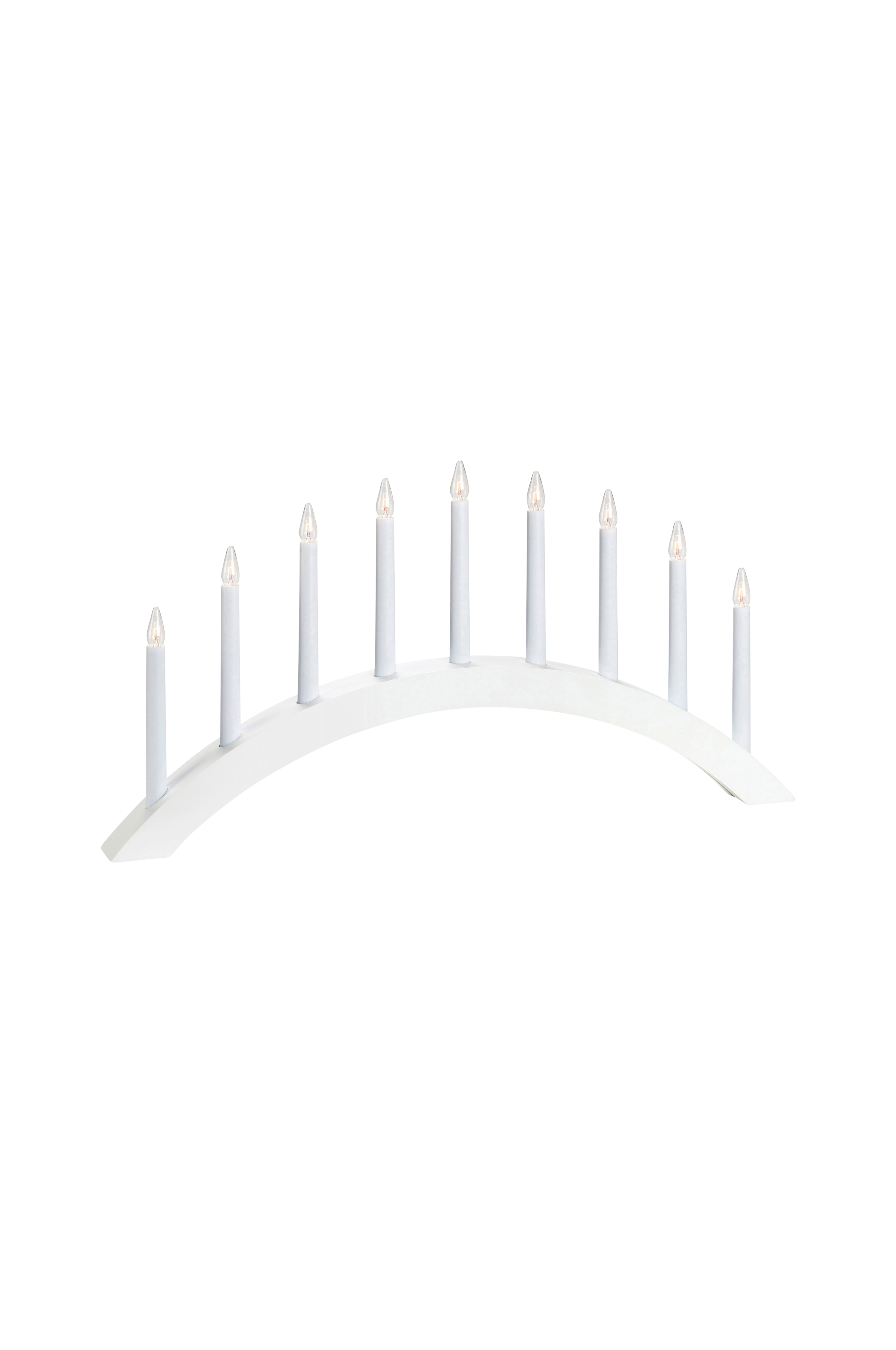 Atle er en herlig klassisk lysestake i tre, i fin bueformet design. Lett å finne plass til både på kommoden i gangen eller i vinduet i stua. Lampen trenger ni klare pærer med E10-sokkel på maks 3W, inkludert. 2 meter lang, hvit ledning med strømbryter. Høyde 35 cm, bredde 66 cm og dybde 5 cm.