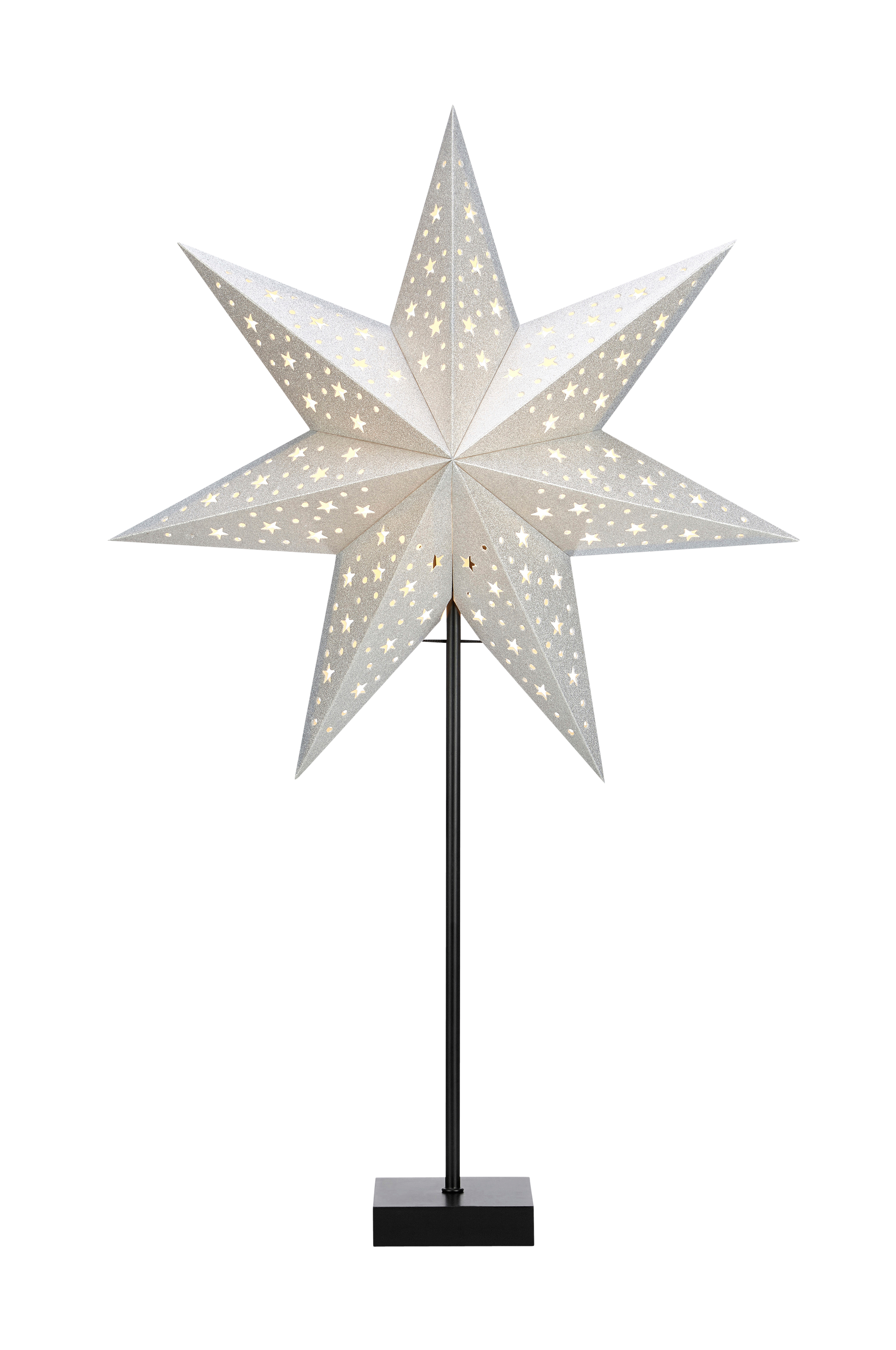Solvalla Bordstjerne. Lampens fot er i tre og metall, skjermen er av papir. Høyde 69 cm, bredde 45 cm, dybde 21 cm. Bredde lampefot 10 cm. E14 sokkel, maks. 25 W. Ledningslengde 2 meter.