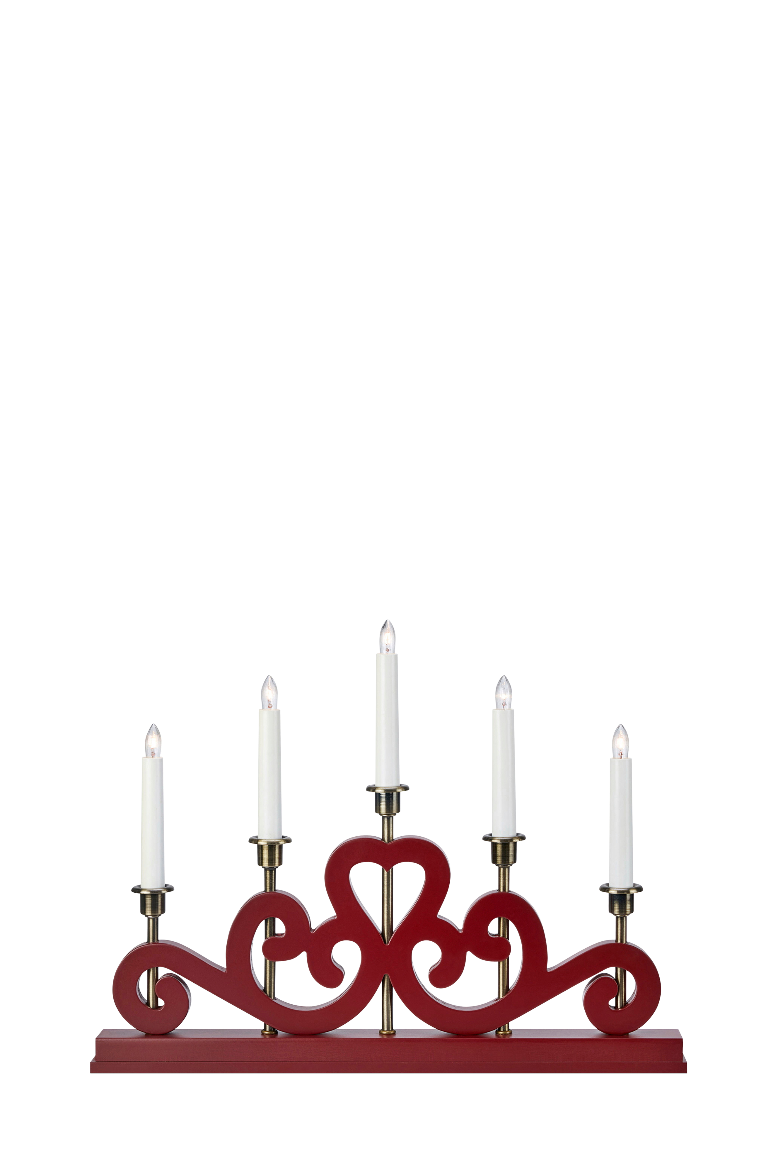 Eneby lysestake fra markslöjd. Base i rødt tre og lysestaker i satin/nikkel. Stearinlys i hvit plast. 2 m hvit pvc-kabel med bryter på ledningen og veggplugg. 5xe10, maks 3w. Lyskilder inkludert.