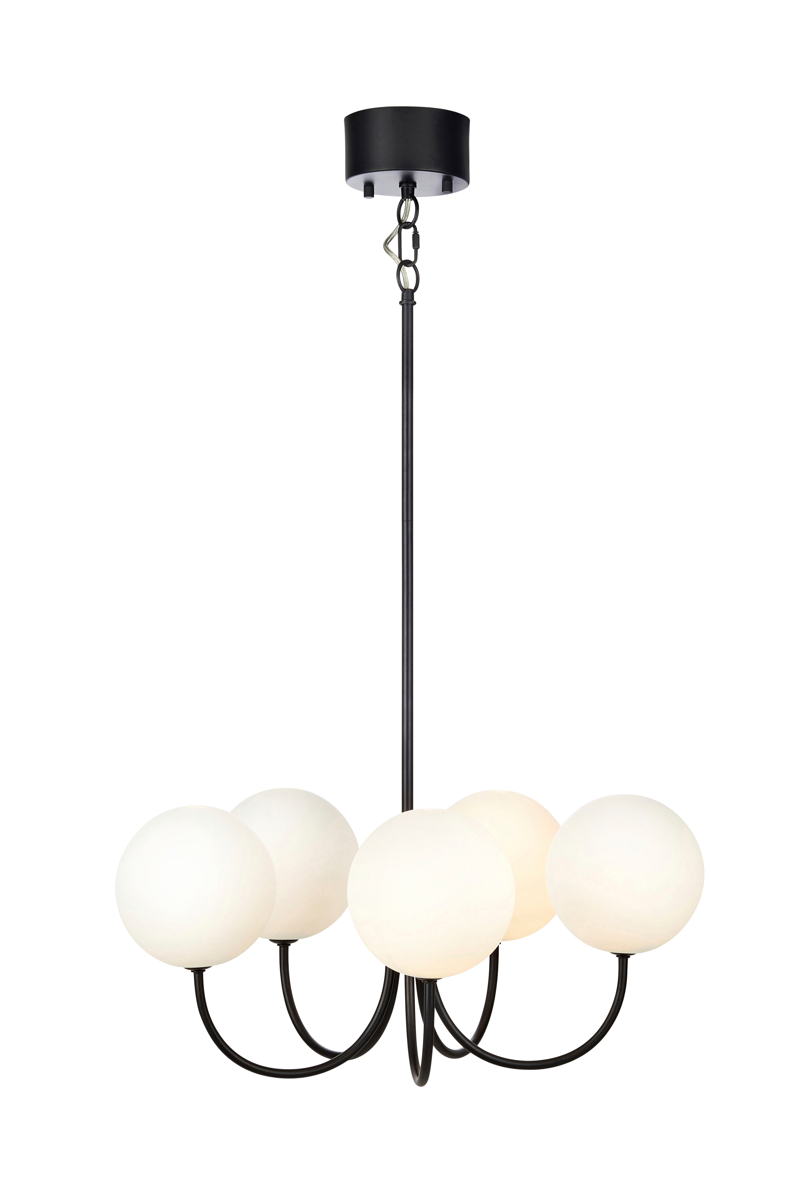 Cinco takpendel fra Markslöjd. Svart taklampe med stamme i metall og med fem hvite glassglober. 150 cm svart ledning. Henges opp i takkrok. Justerbar. Mål: Bredde 54 cm, dybde 54 cm og høyde på glasskuppel 26 cm. Maks. 5x20W. G9-sokkel. Kan dimmes. Jordet
