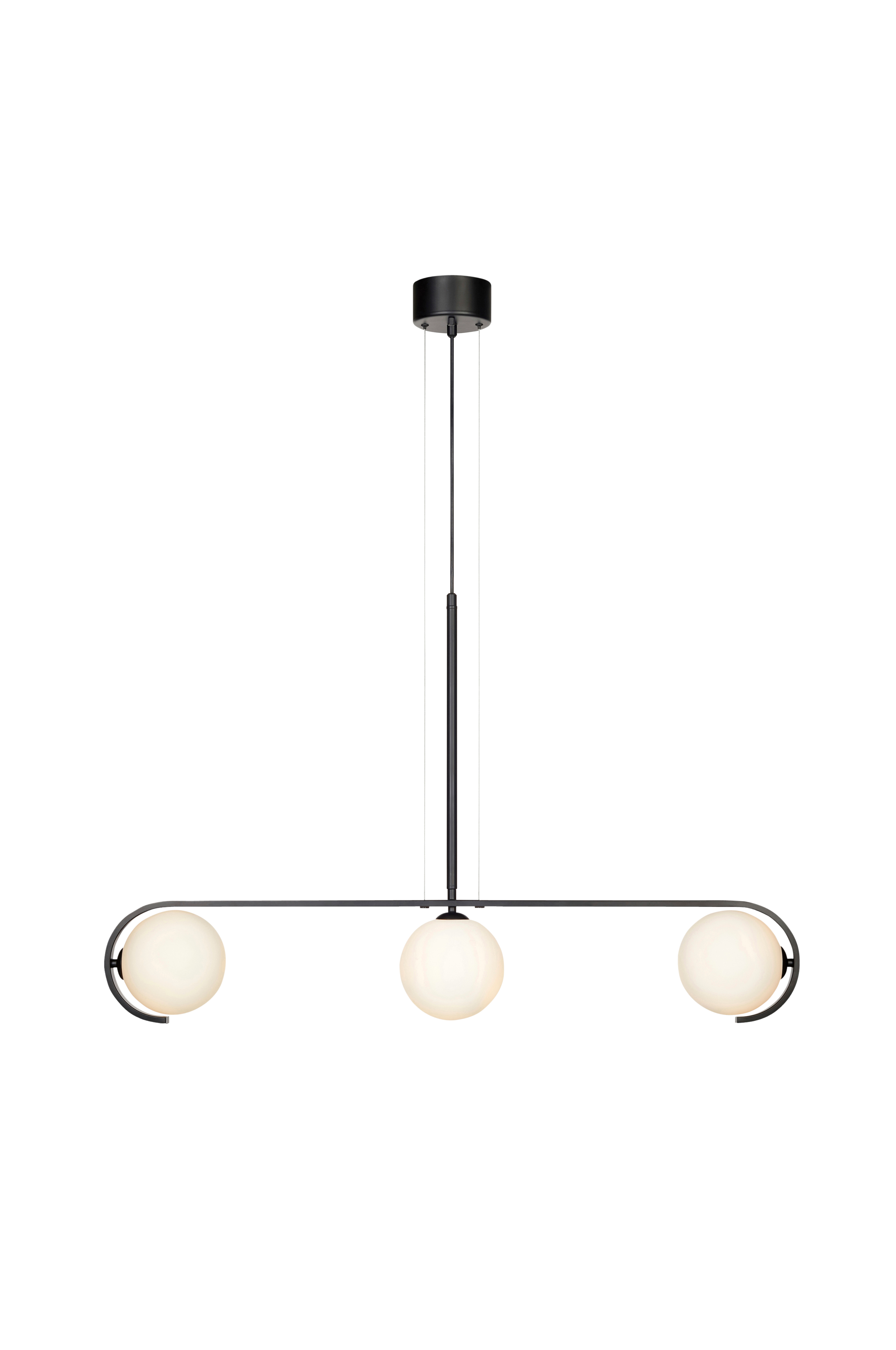 Pals takpendel fra Markslöjd. Takpendel i svart metall med tre hvite glassglober. Designet av Joakim Thedin. 150 cm transparent ledning. Monteres i takkrok. Mål: Bredde 100 cm, dybde 15 cm og høyde 37 cm. Maks. 3x20W. G9-sokkel. Lyskilde medfølger ikke. Kan dimmes. Jordet