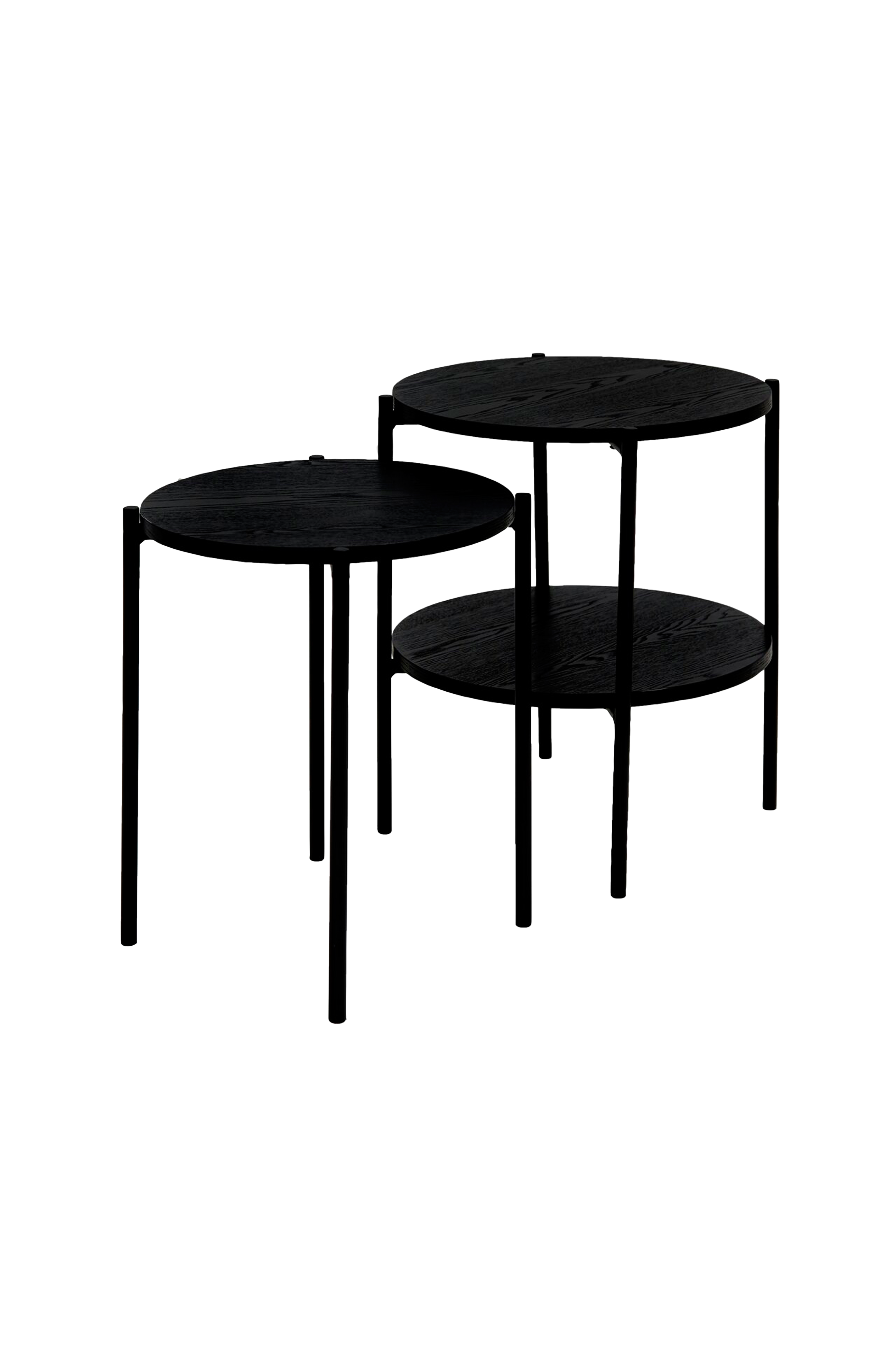 Moderne og praktiske sidebord i sett med 2. Fungerer bra sammen eller separat. Platene er i askefinér. Sandblåste metallben.