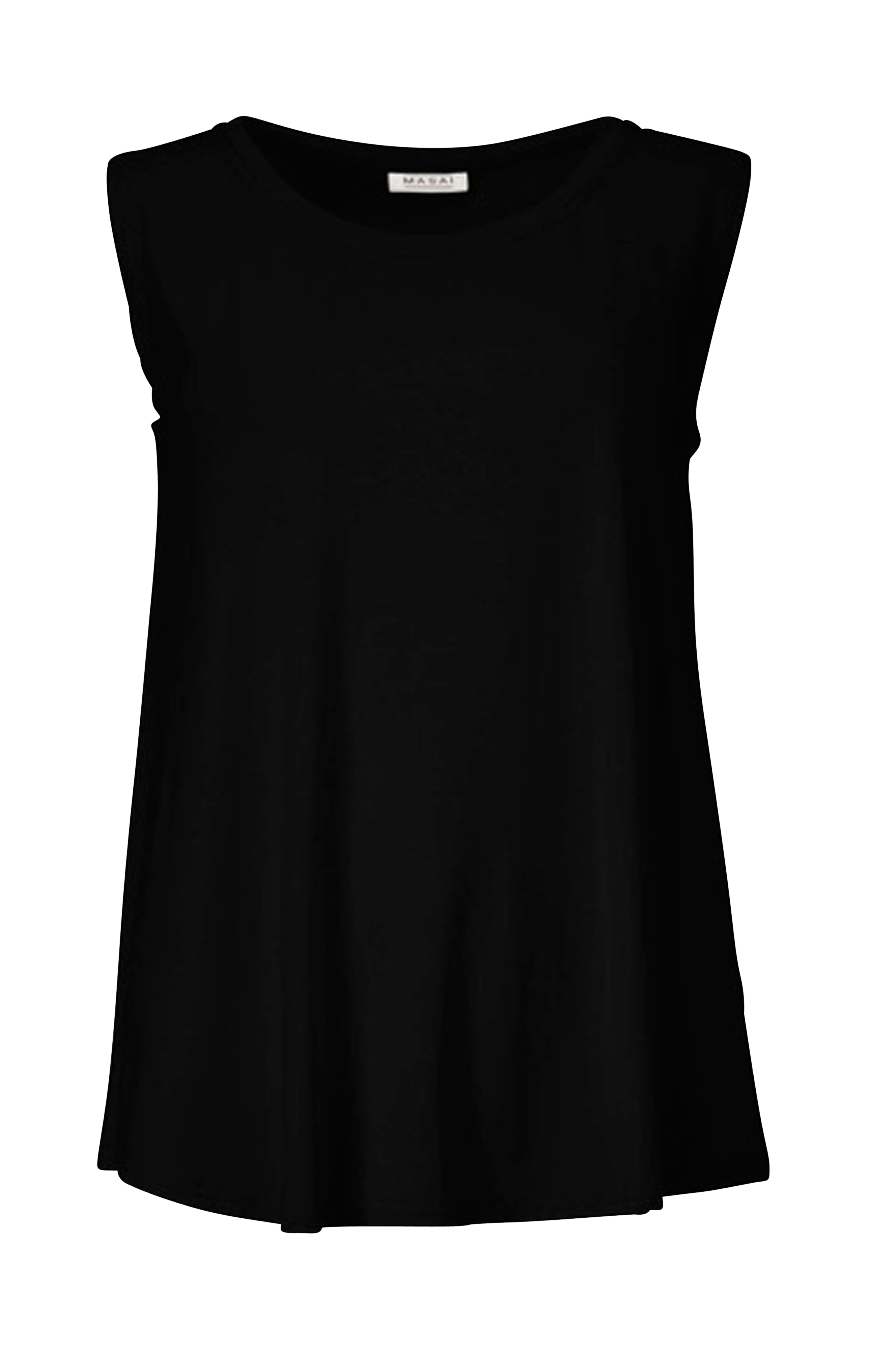 Topp Elisa Basic fra Masai. Utsvingt, ermeløs modell med herlig vidde. Rund hals med smal ribbekant og lett rundskåret nederkant. Fin stretchtrikot med mykt fall.