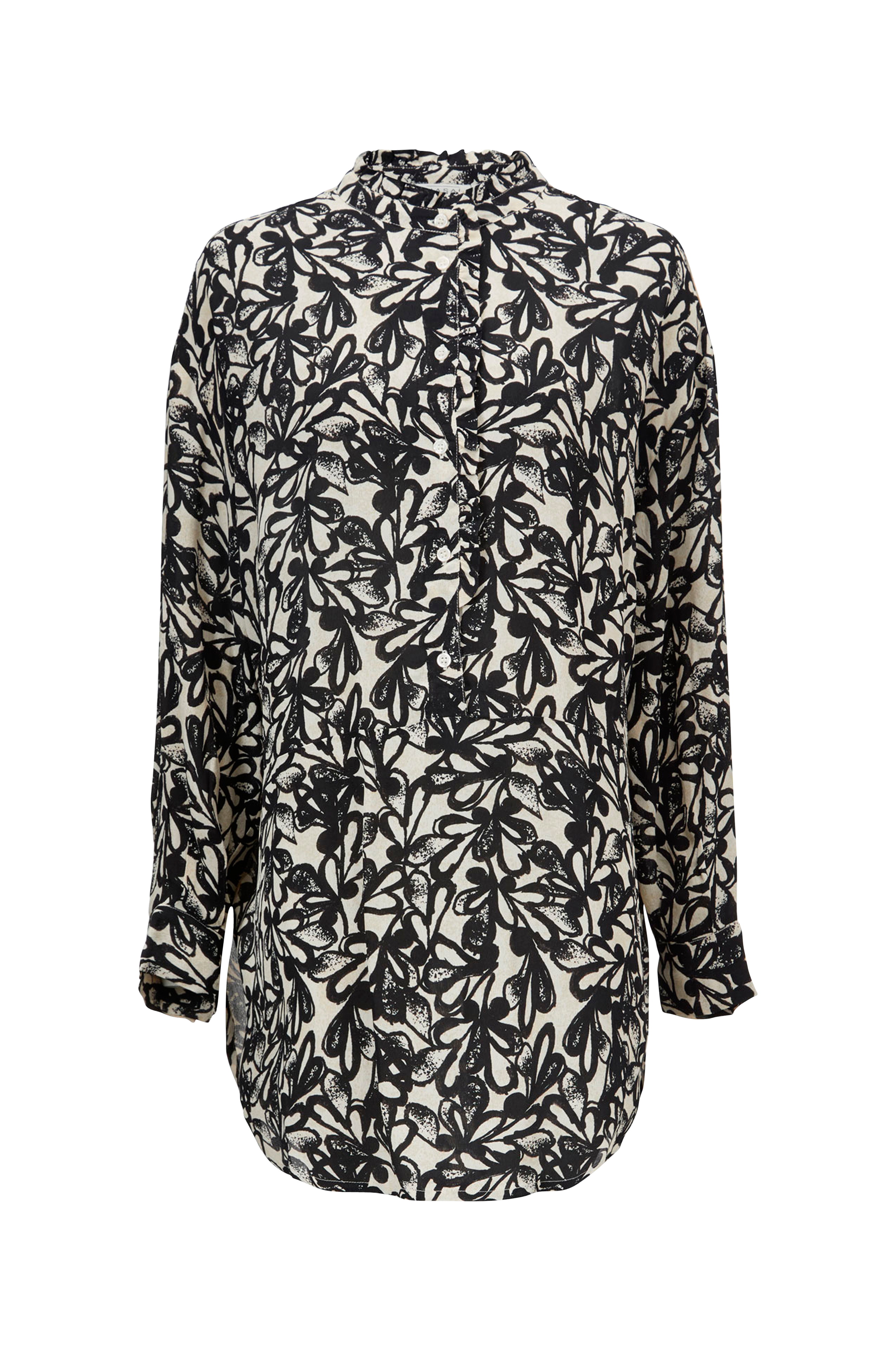 • Halvlang frontknepping med rysch• Rund hals med rysch• Langt erme med mansjett• Splitt i sidene• Løs passform• Lengde: 78 cm i størrelse S