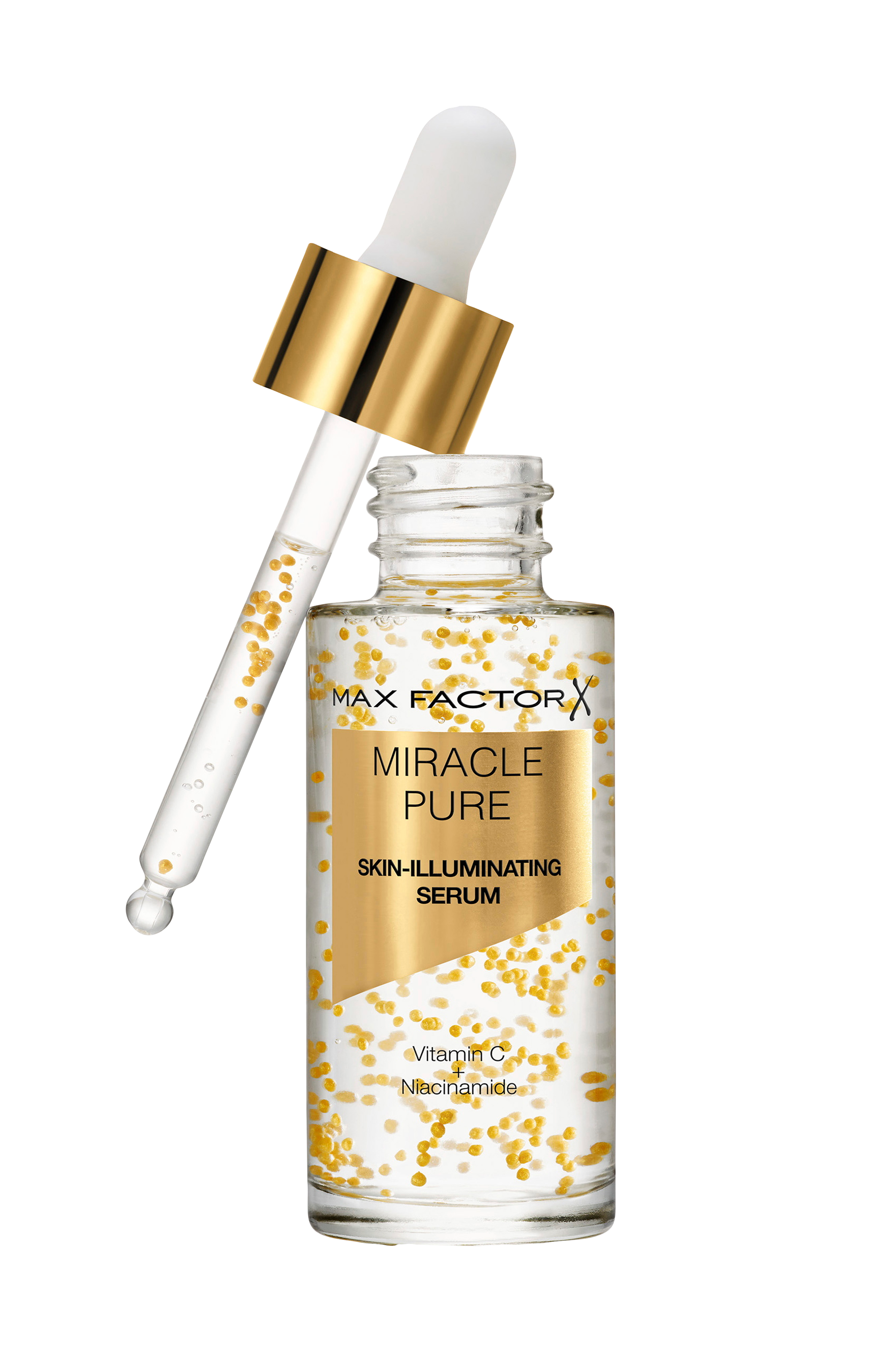 Gi huden en daglig boost av vitaminer for en umiddelbar sunn glød med Max Factor Miracle Pure Skin-Illuminating Serum. Dette hudpleiende og glødgivende serumet inneholder gylne gullperler med lysreflekterende pigmenter som gir huden en vakker glød med utglattende og lysnende effekt. Den klinisk testede, veganske formelen er skapt med fuktighetsgivende C-vitamin og niacinamide-B3.
