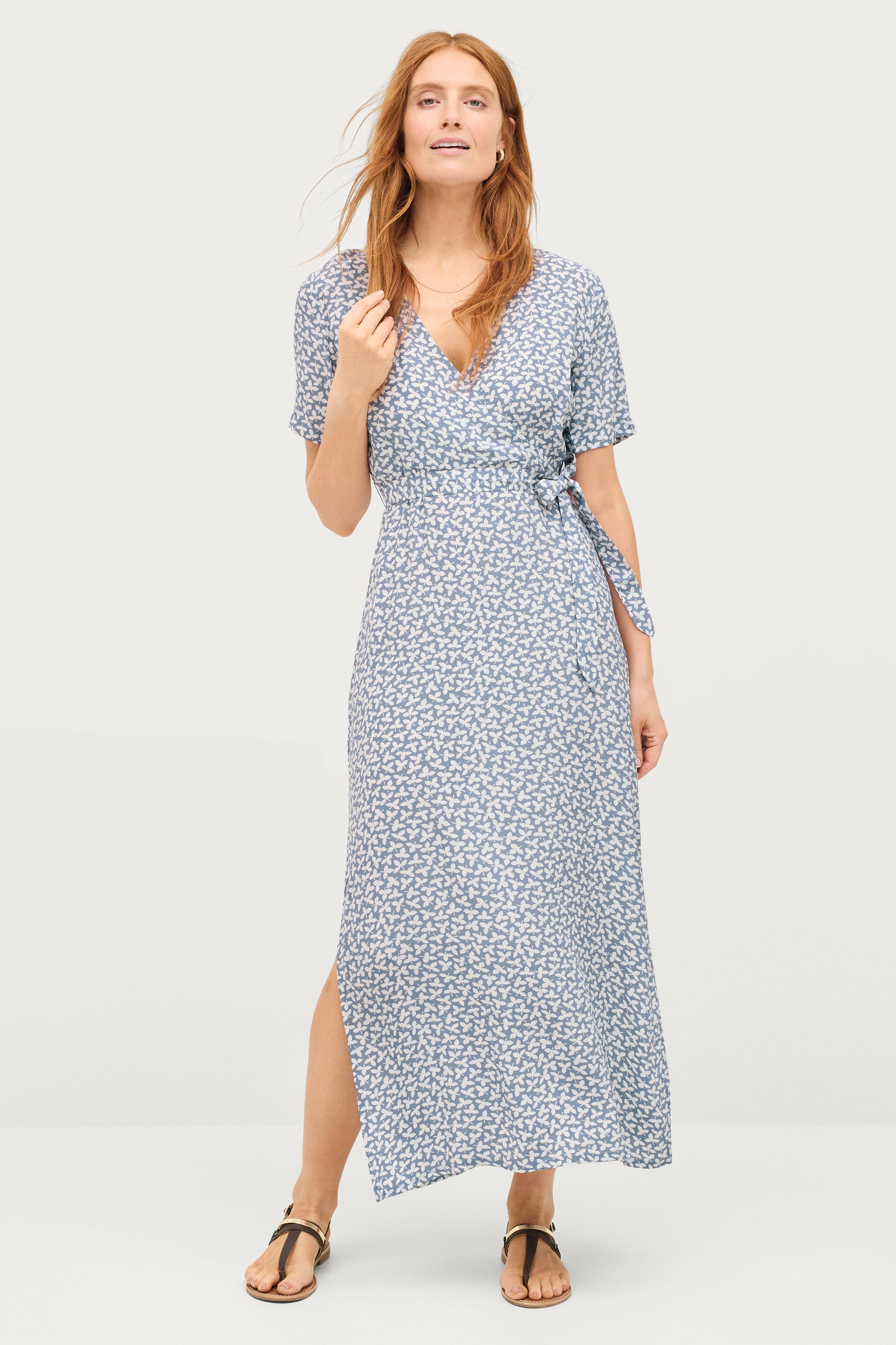• Øvre del med omslag• Korte ermer• Knytbart belte ved midjen• Skjult glidelås i siden• Splitt foran• Lengde: 136 cm i størrelse S