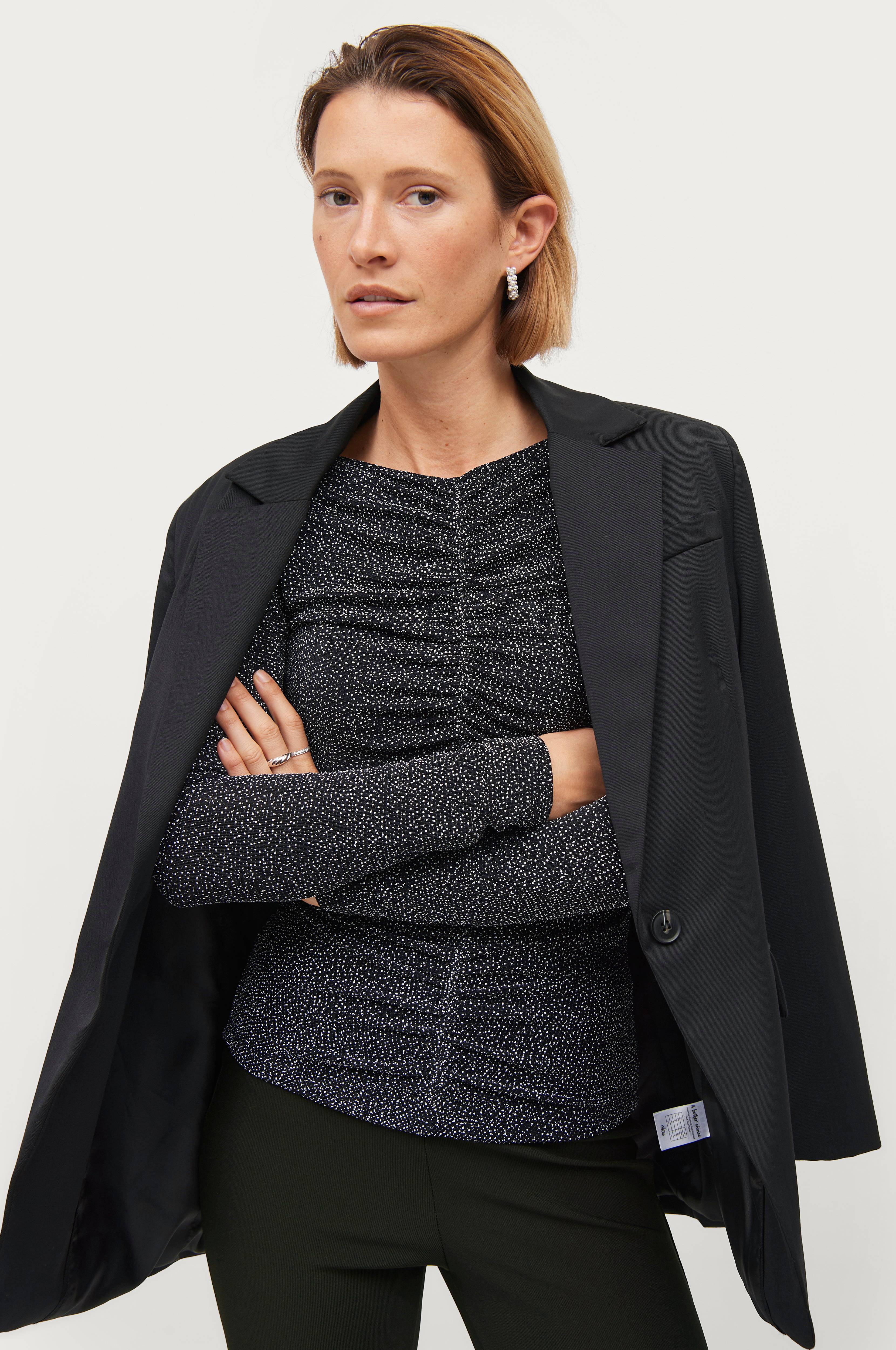 • Stretchy, glitrende stoff med prikkmønster• Rysje foran med drapert effekt• Rund halsringning