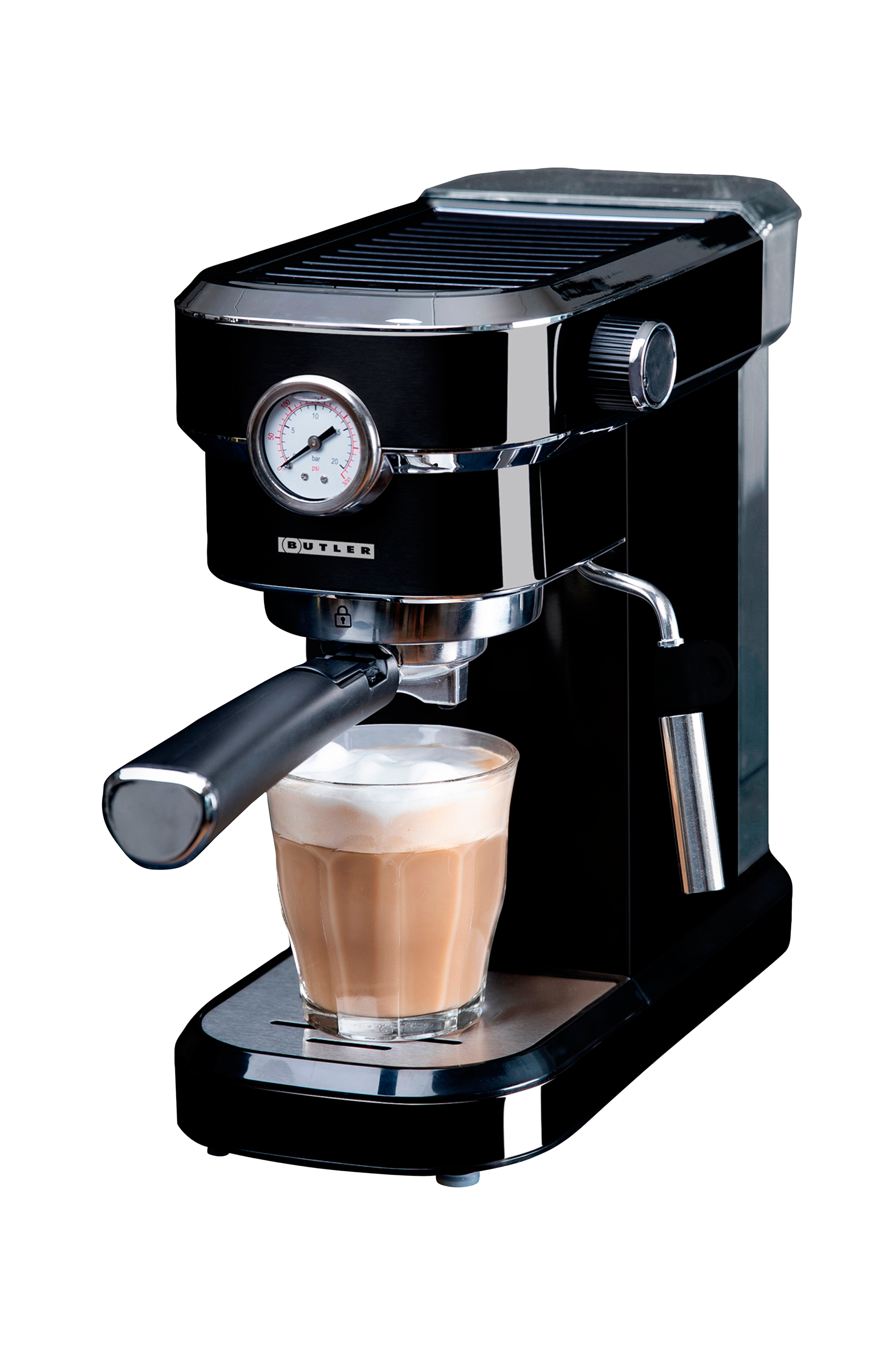 Espressomaskin med uttagbar vanntank og traktekapasitet på to kopper - passer perfekt i en liten husholdning. Lag enkelt en latte eller en cappucino ved hjelp av den innebygde melkeskummeren.