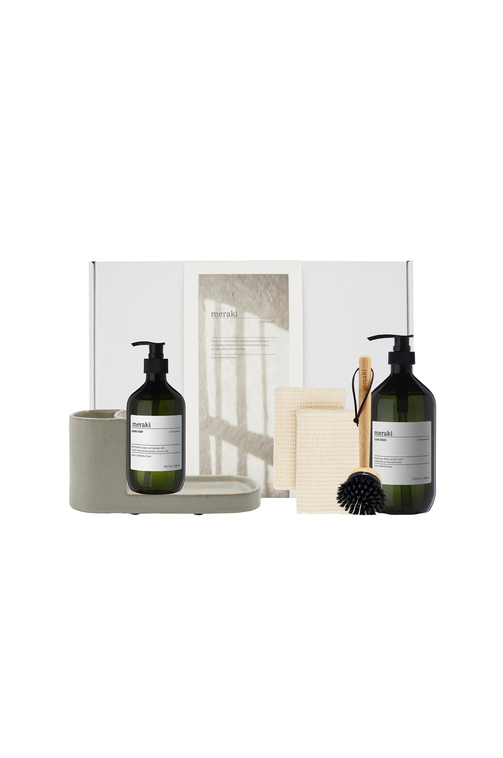 Et praktisk og elegant kjøkkensett med hverdagens nødvendigheter. gift box inneholder Datura børste og såpeholder i glasert steingods, en oppvaskbørste i bambus med utskiftbart hode, Forest Garden oppvaskmiddel med forfriskende noter av mynte og sitron i 1000 ml og Anti-odour håndsåpe i 490 ml.