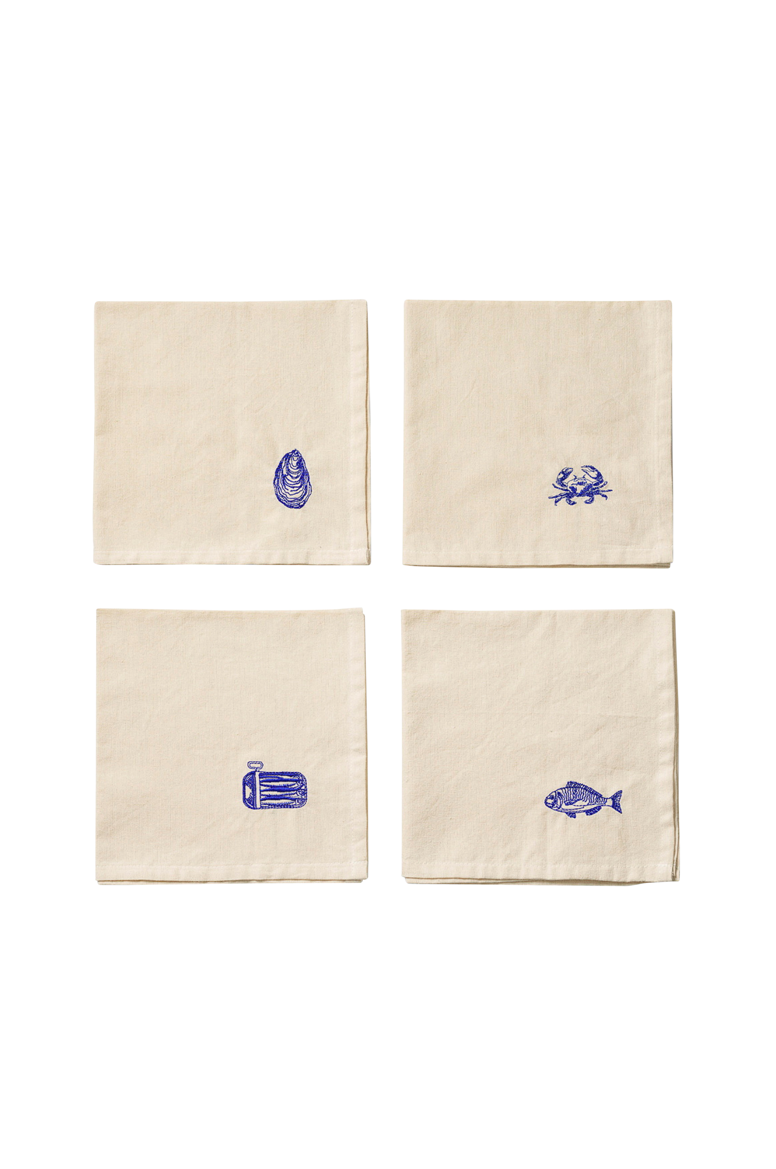 Disse serviettene fra det svenske merket Midnatt kommer i et sett med fire. De har fire individuelle sjøinspirerte broderier i koboltblått på en beige bunn. Broderiene består av en østers, en krabbe, en havbrasme og en boks med sardiner. Serviettene er 40×40 cm store. La mer-serviettene er GOTS-sertifiserte og laget av 100 % økologisk bomull. Vaskes på maks 60 grader.