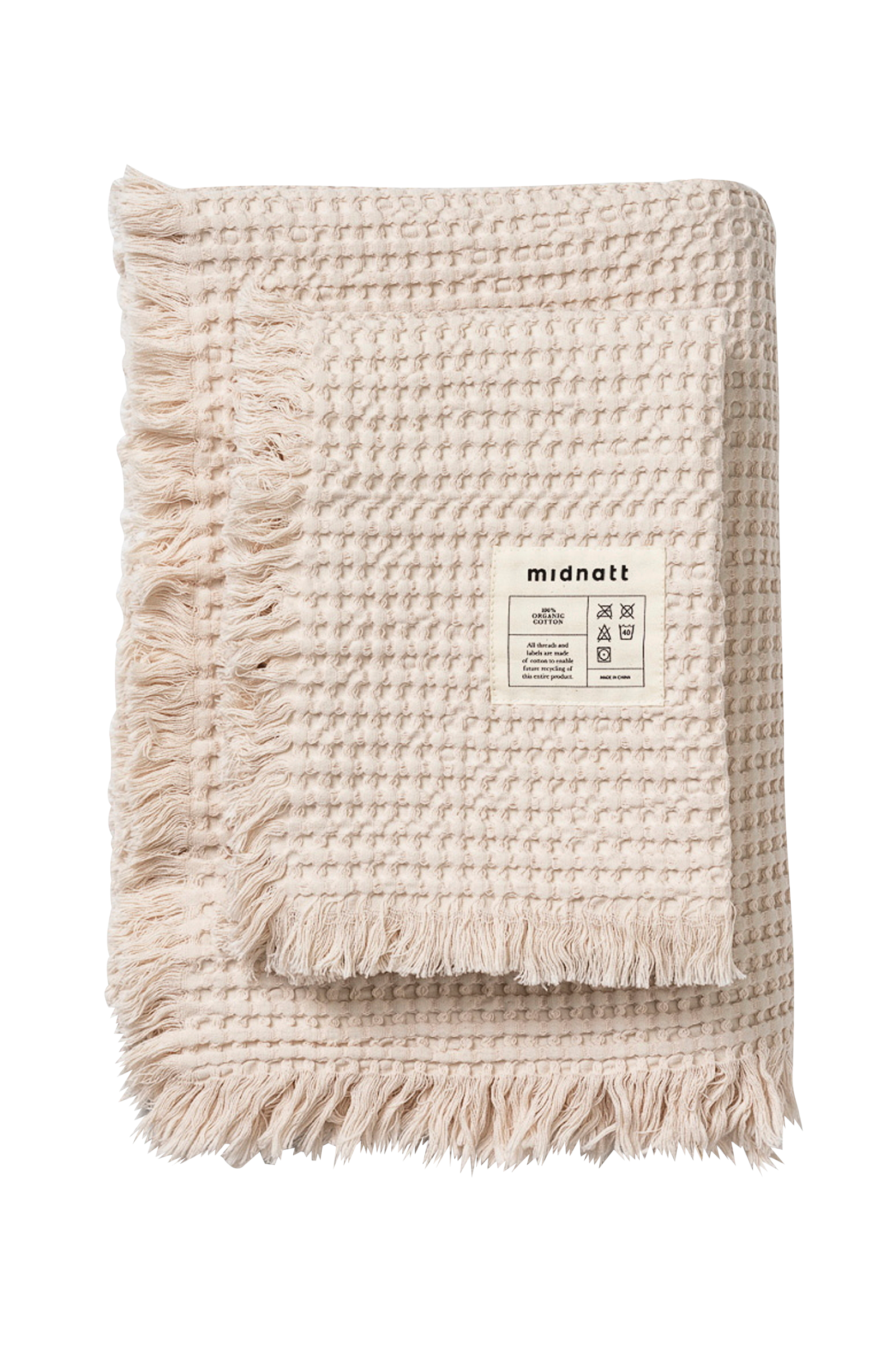 Disse varme, hvite og luftige vaffelhåndklærne fra Midnatt er tilgjengelige i to størrelser, ett stort badelaken og ett mindre håndkle. Håndklærne er laget i 100 prosent økologisk bomull med vafler i stor størrelse som gir et flott utseende og en god følelse. Det lille håndkleet har to opphengsløkker, og det større har én opphengsløkke på langsiden. Vi har designet den overdimensjonerte vaskeetiketten slik at den enkelt kan fjernes hvis du foretrekker det. Det større håndkleet kan også brukes som et lite teppe.