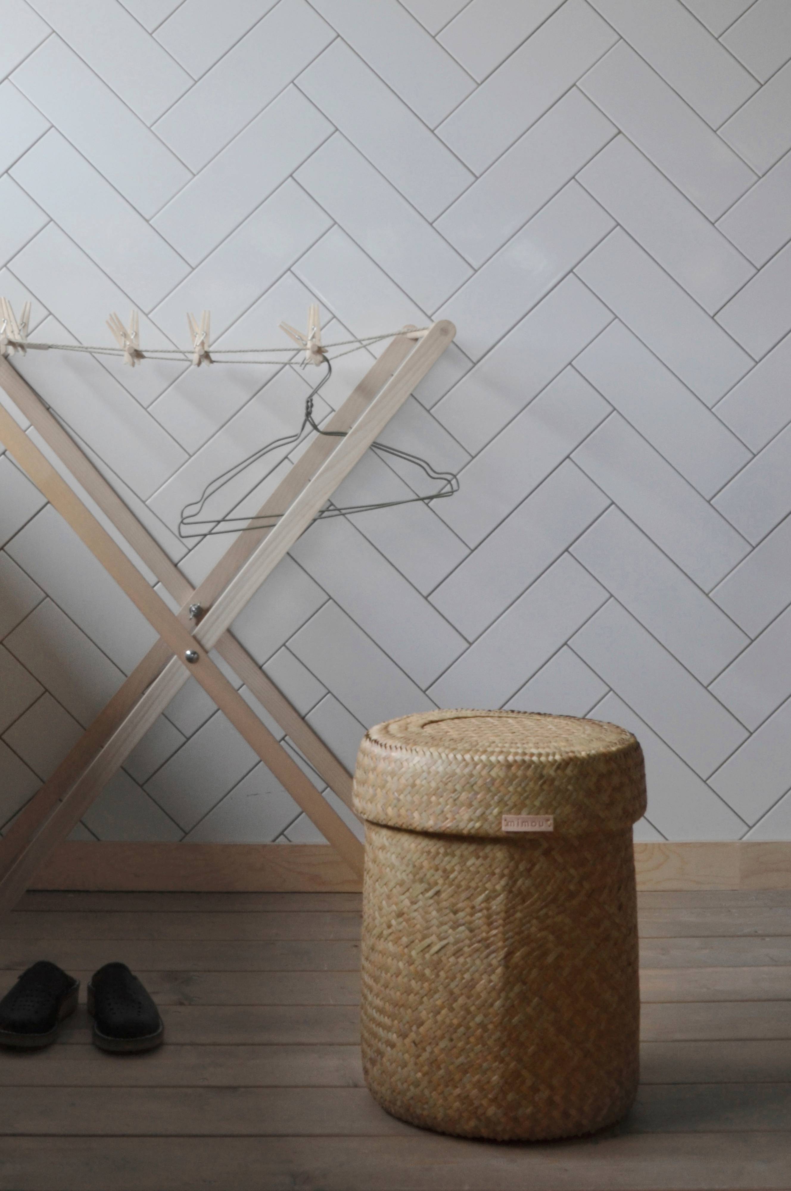 Kurv med flatt lokk, flettet for hånd av sjøgress av et kollektiv sør i Thailand. Størrelsen egner seg som liten skittentøyskurv, papirkurv samt til oppbevaring av leker eller lesestoff. Den er til og med stødig nok til å brukes som et lite bord. Høyde 37 cm, diameter 30 cm.