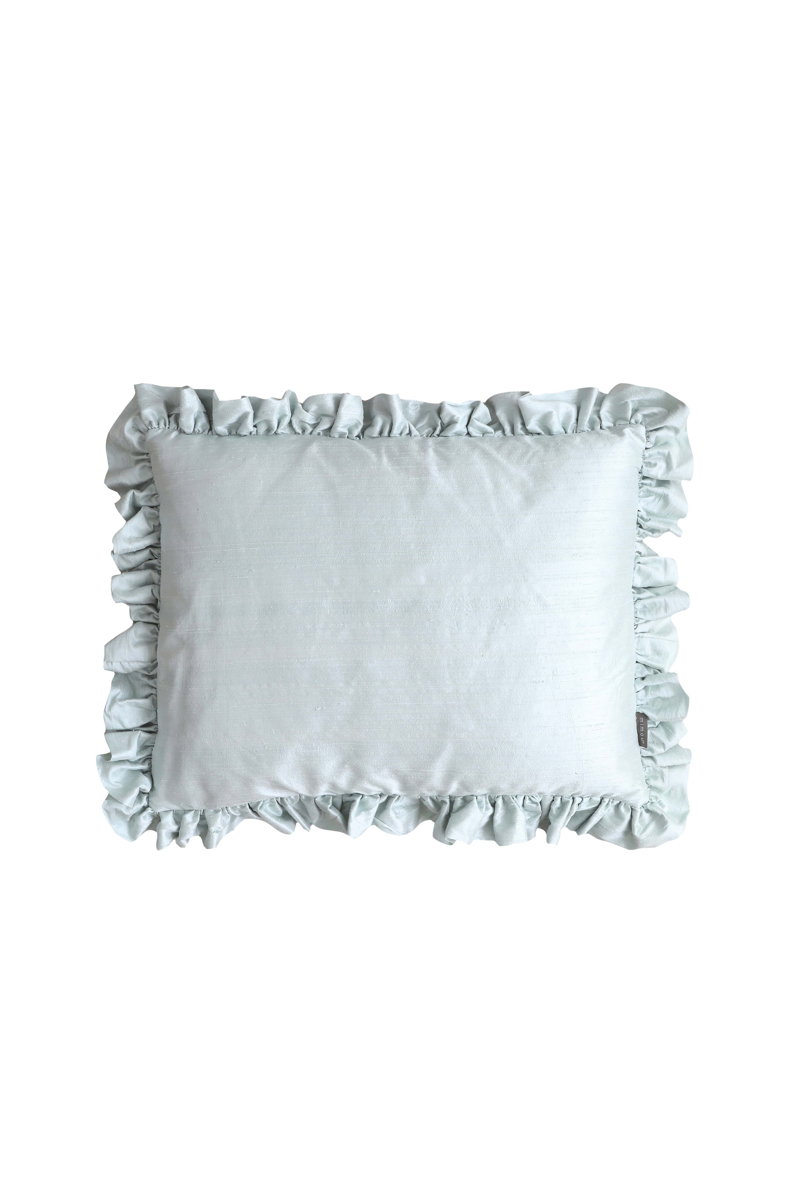 Håndlaget pute med volang av dobbelt stoff. Den store pynteputen har en side av kraftig portugisisk lin og en side av gjenbrukt, håndvevd silke. Det er et mye mer bærekraftig valg å gjenbruke materialer istedenfor å bruke nye, og er et steg mot å redusere mengden tekstilavfall. Selges inkludert innerpute av andefjær. Størrelse: 50X60 cm + 7 cm volang