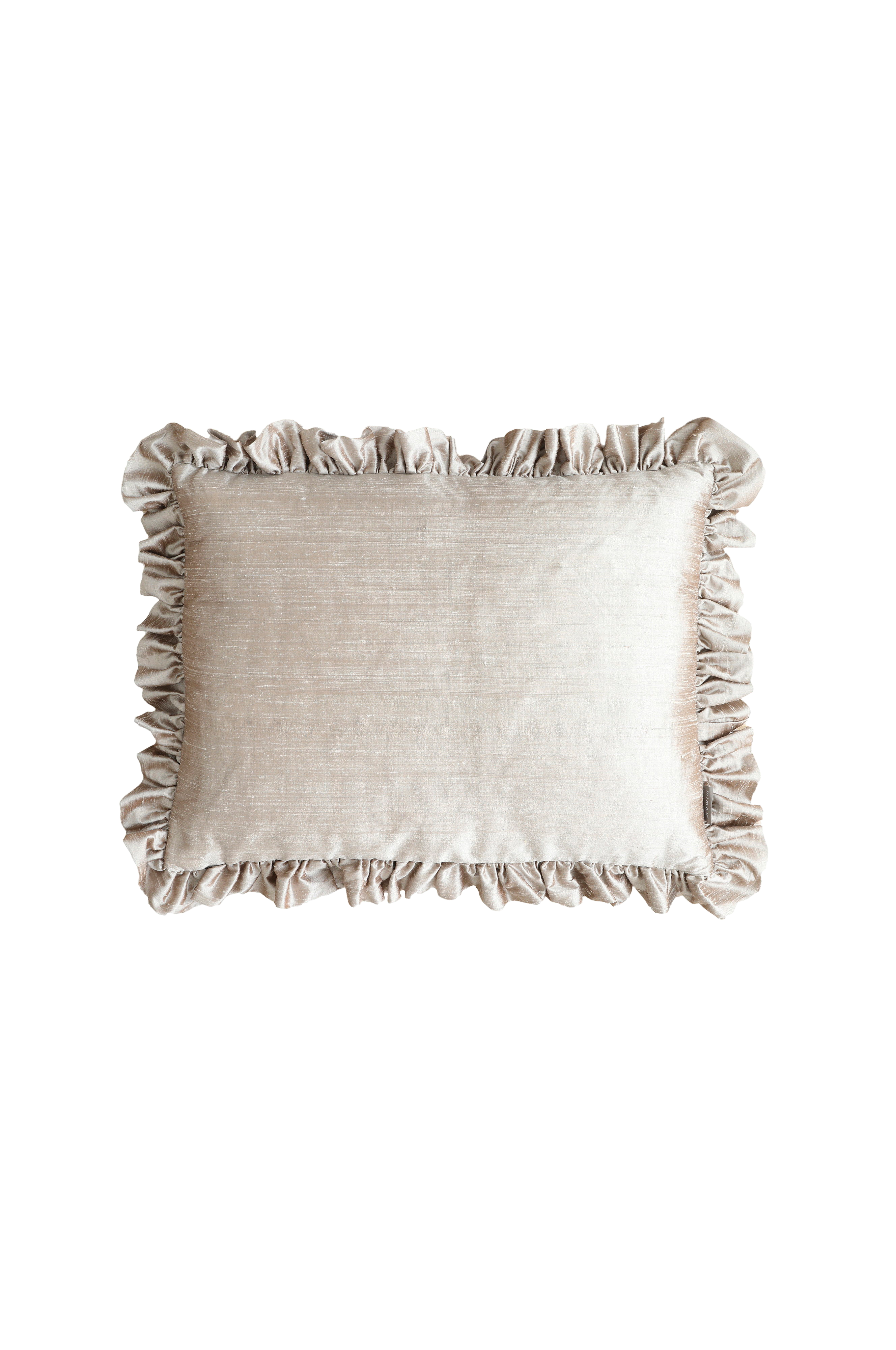 Håndlaget pute med volang av dobbelt stoff. Den store pynteputen har en side av kraftig portugisisk lin og en side av gjenbrukt, håndvevd silke. Det er et mye mer bærekraftig valg å gjenbruke materialer istedenfor å bruke nye, og er et steg mot å redusere mengden tekstilavfall. Selges inkludert innerpute av andefjær. Størrelse: 50X60 cm + 7 cm volang