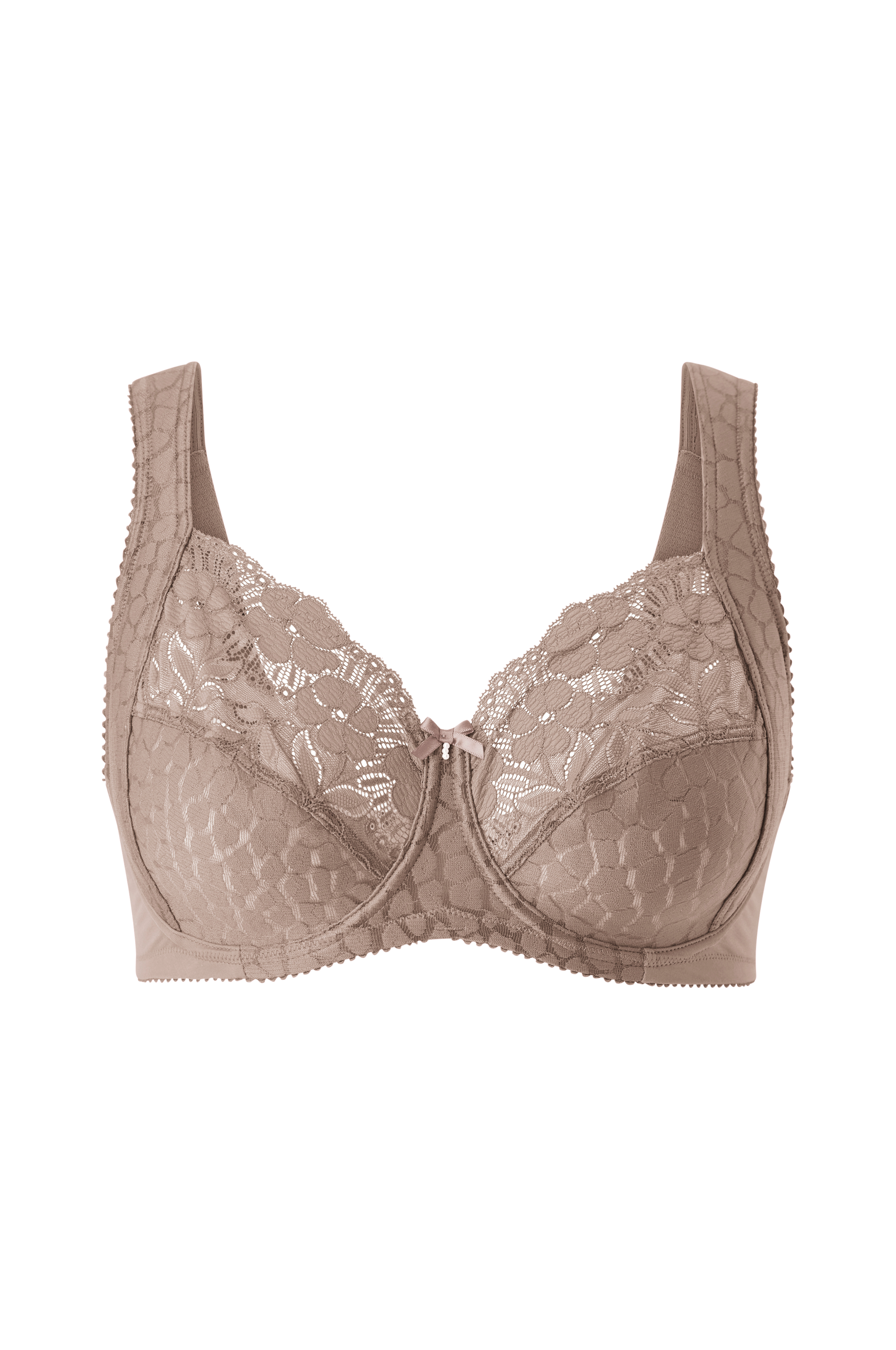 Bh med hele cuper med todelt skjæring og vattert sidestøtte. Uelastisk materiale i undercupene løfter og sentrerer også den tunge bysten. Produsert i en kombinasjon av stretchblonde og jacquard. Vatterte skulderbånd og hektelukking bak.