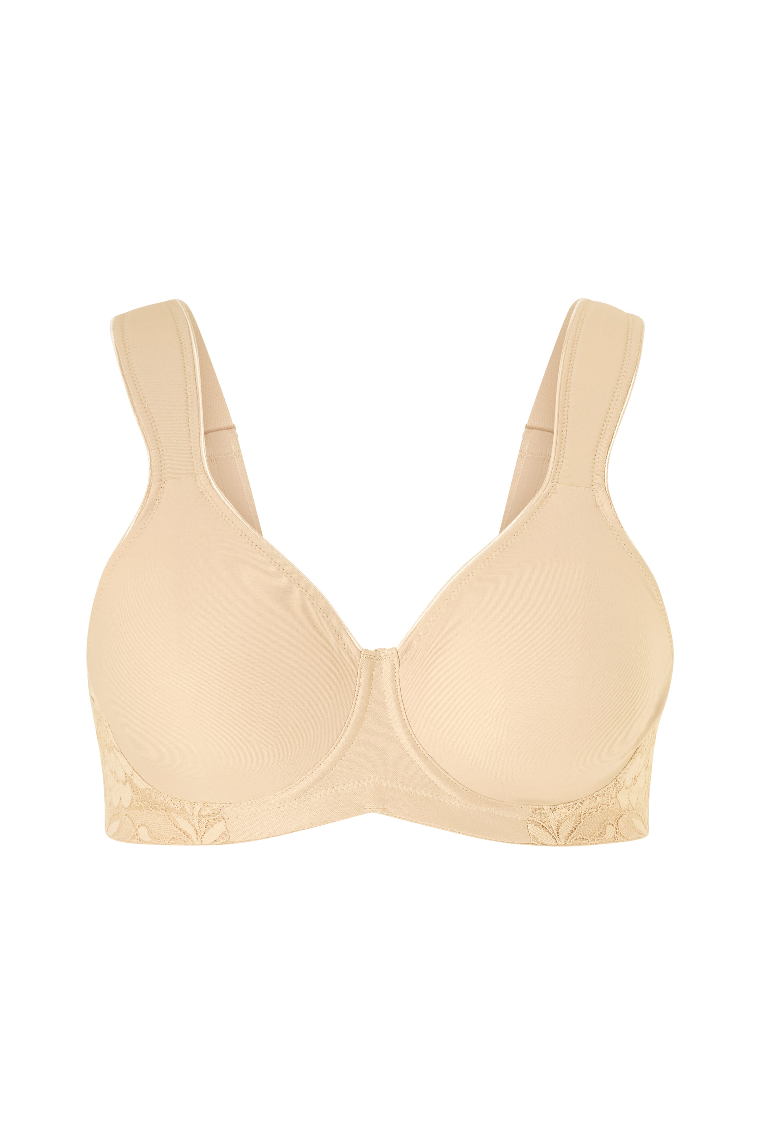 BH med bøyler i Keep Fresh-funksjonsstoff som holder huden tørr og frisk selv når du er varm. Formpressede, upolstrede og sømløse kopper gjør BH-en usynlig under klærne. Mellom skålene er det et stumt materiale som gir bh-en stabilitet. Fra midten under koppen og hele veien rundt ryggen er det vakre blonder med underliggende netting som gir denne funksjonelle BH-en et luksuriøst utseende. Materialet er pustende, fleksibelt og glatt og svært behagelig å ha direkte mot huden. Den opphøyde Ergo Front™-kanten foran gir ekstra komfort når du setter deg ned, og forhindrer at kanten ruller eller bretter seg. Brede, polstrede, justerbare skulderstropper og bred U-formet rygg med borrelås.