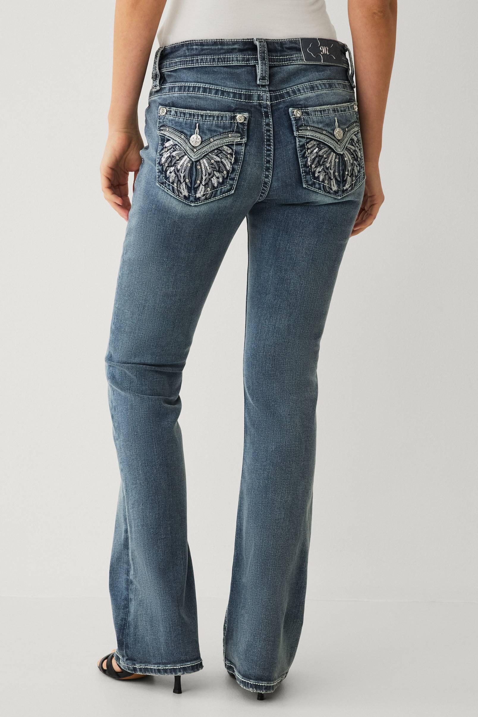 • Boot cut jeans med lav midje• Lynlås• Femlommemodell med paljetter og rhinstener på baklommene