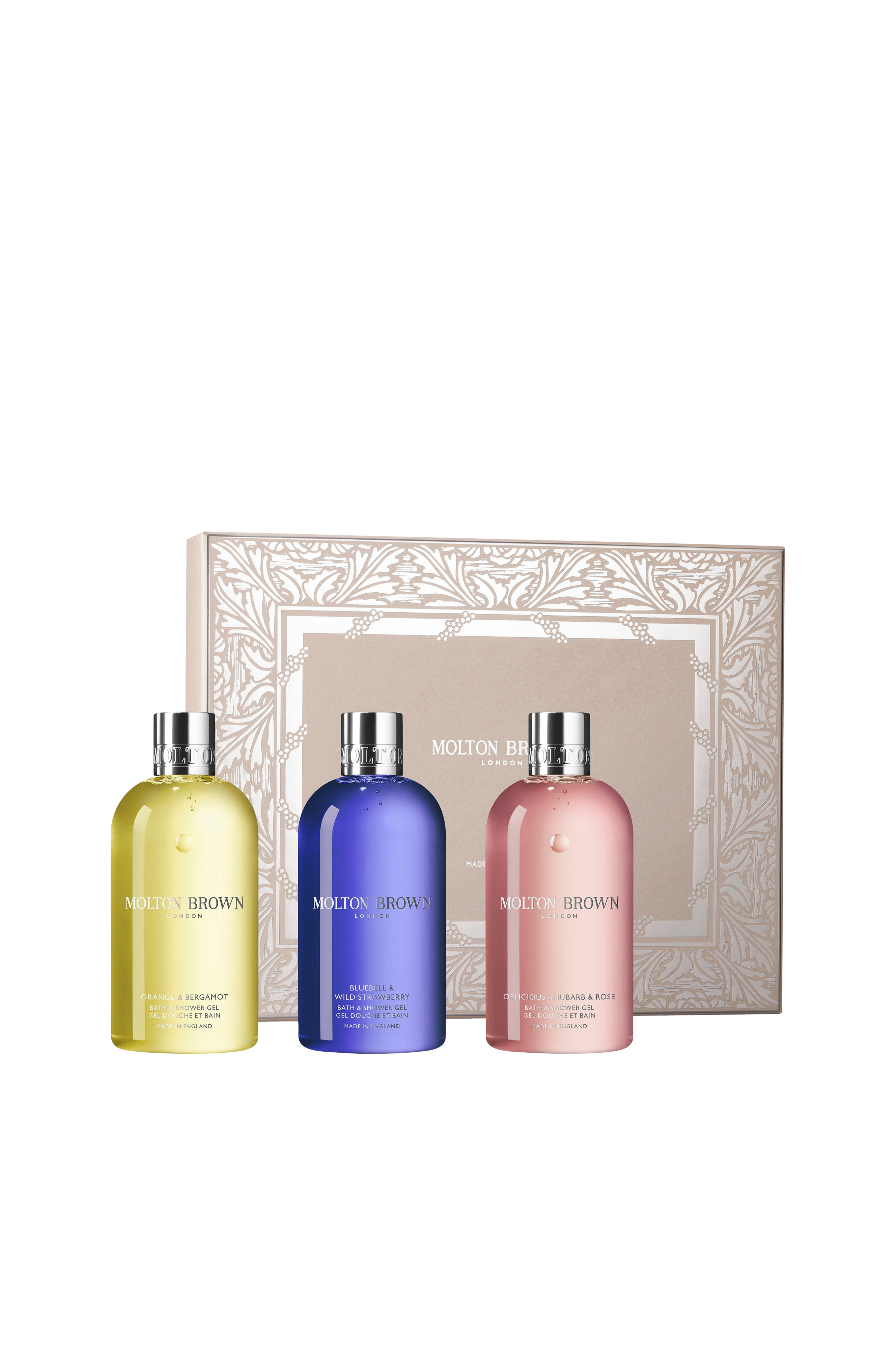 Floral & Fruity Body Care Gift Set fra Molton Brown er en solfylt flukt i tre deler - designet for å lyse opp vinterdagene med eksplosjoner av blomster- og fruktig glede. Dette trioen med bad- og dusjgel i full størrelse tar deg med fra en gårdsplass i Sevilla omgitt av appelsintrær, til en blomstrende skogstur og en vårpiknik full av jordbær og rabarbra. Den perfekte gaven til de som elsker oppløftende dufter inspirert av lysere årstider.