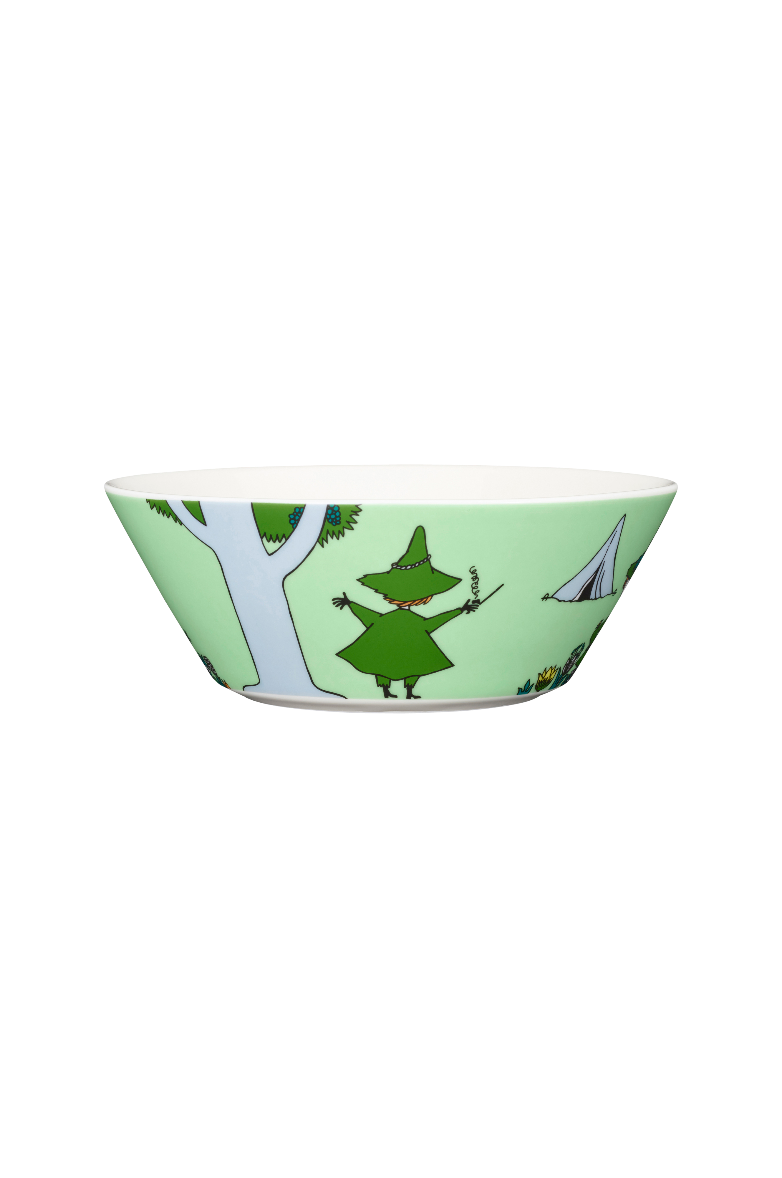 Snusmumrikken er en vennlig eventyrer som spiller på munnspillet sitt og elsker å fiske. Mummitrollet er hans beste venn og Lille My er hans halvsøster. Snusmumrikken har på seg en grønn hatt og vandrer langs landeveiene hvor hen de leder han. Moomin Arabia, bolle 15cm, Snusmumrikken.
