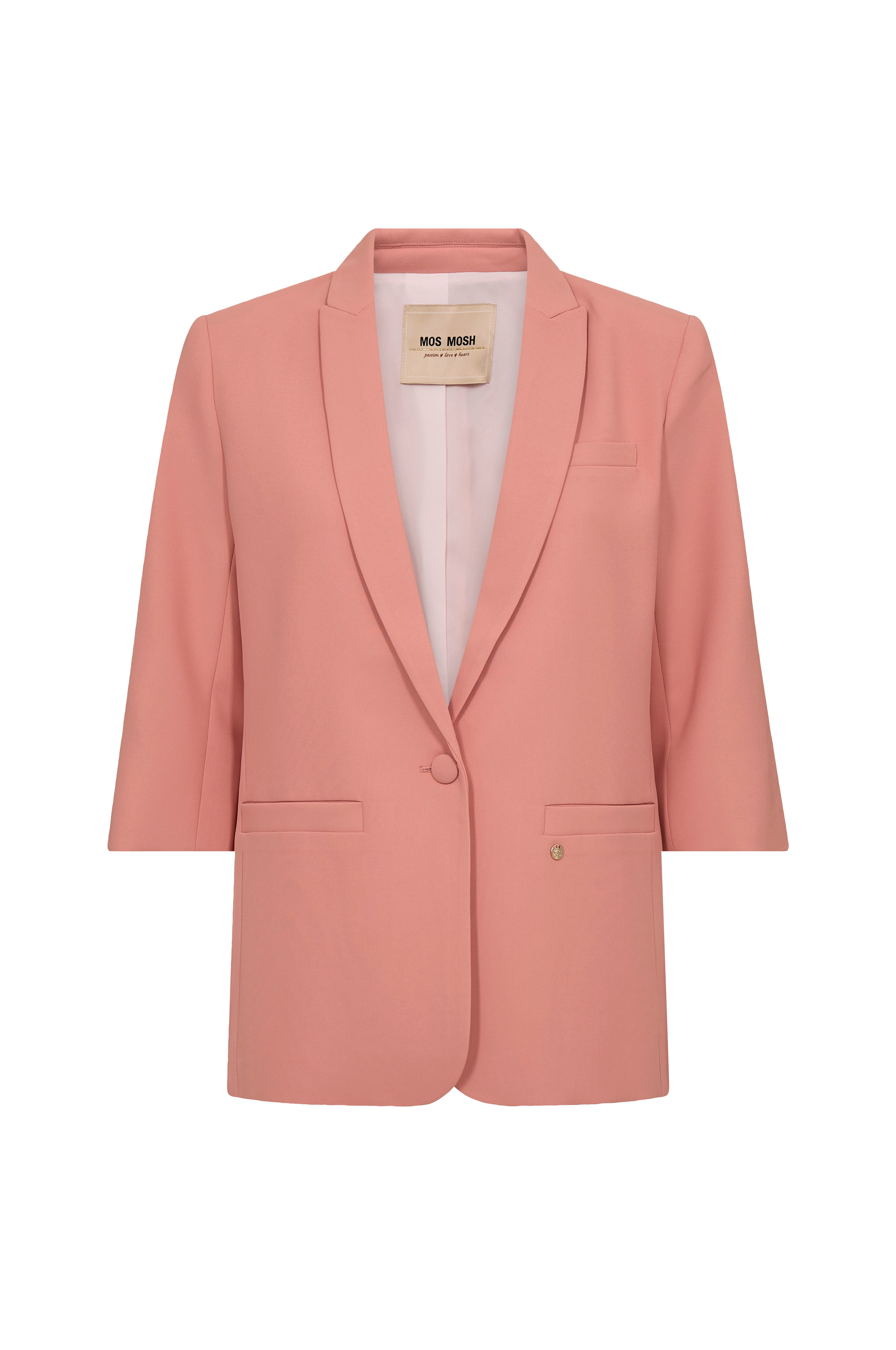 • Lett polstrede skuldre• Lukning med en kledd knapp• To lommer• Ermer 3/4 lang• Kledd knapp i ermeslutten• Skjær nedover ryggen• Lengde: 69 cm i størrelse 36