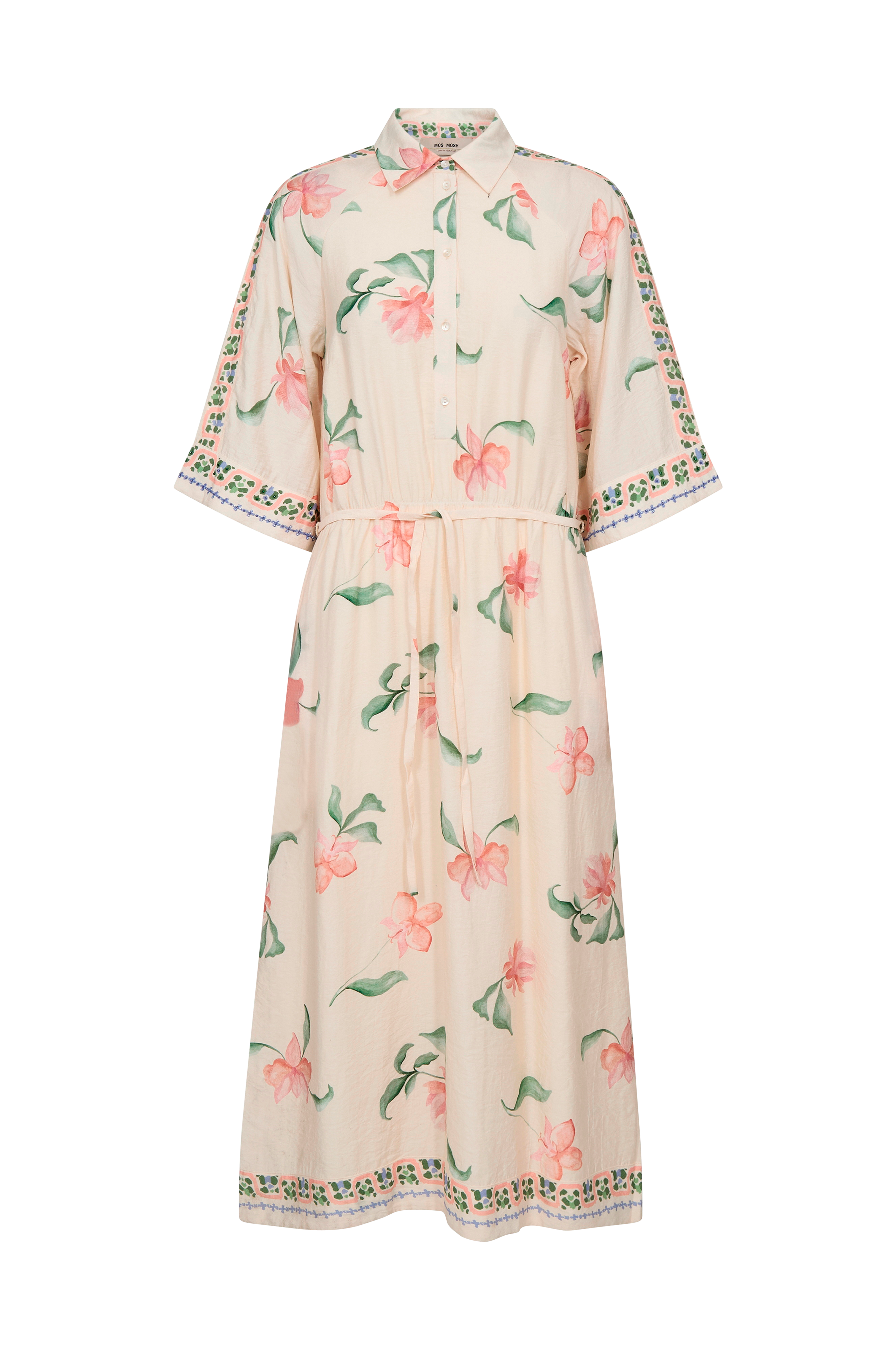 • Knapper oppover foran• Elastisk midje med knytbar tråd• Halvlange ermer med dekorative perler ved armenden• Tynn, vevd foring• Lengde: 124 cm i størrelse S