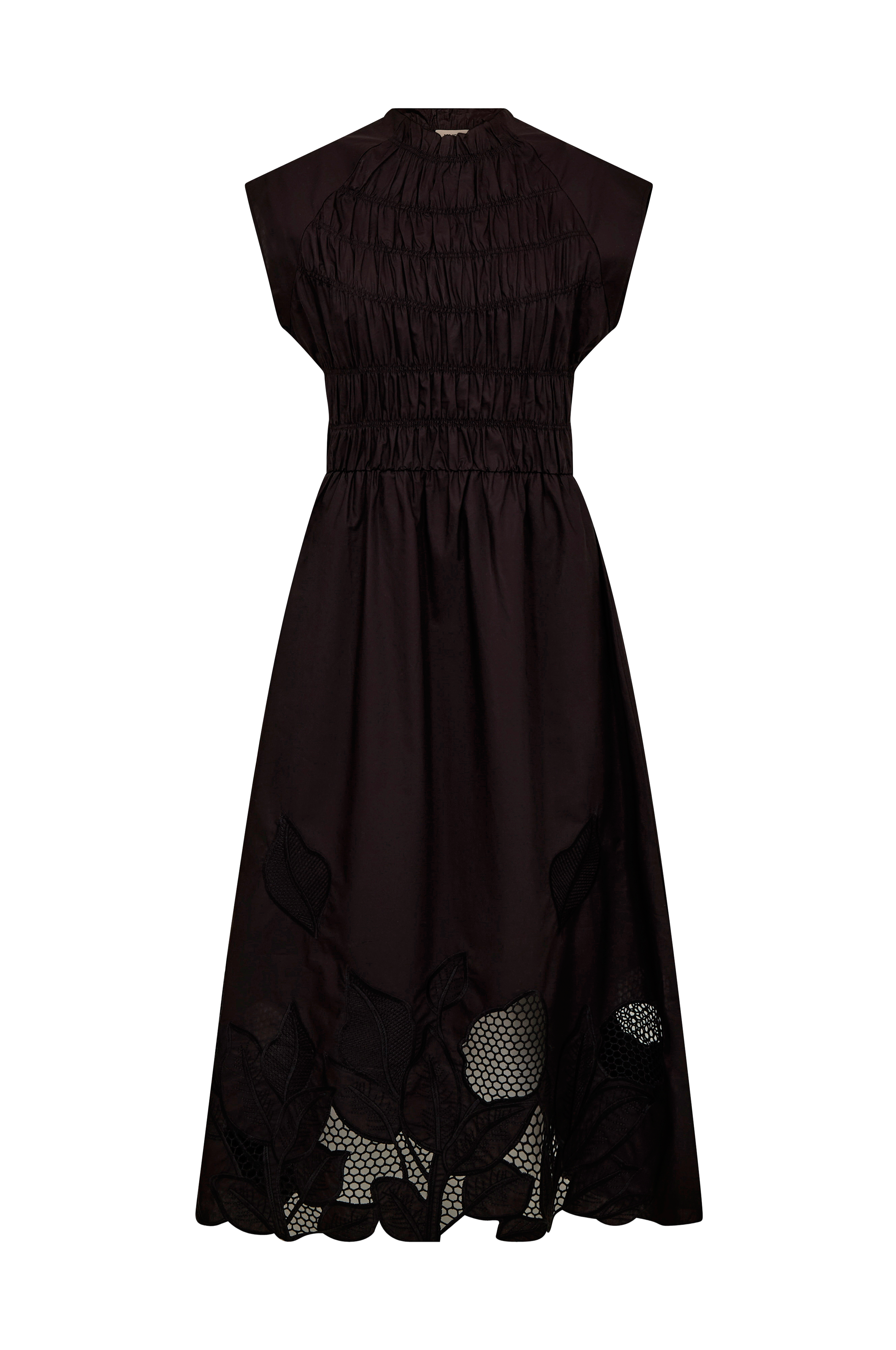 • Lang kjole i bomull• Volangkrage• Korte ermer• Vaffelsøm på toppen• Sidelommer• Hullbroderi på bunnen• Bølget hem• Lengde: 130 cm i størrelse S