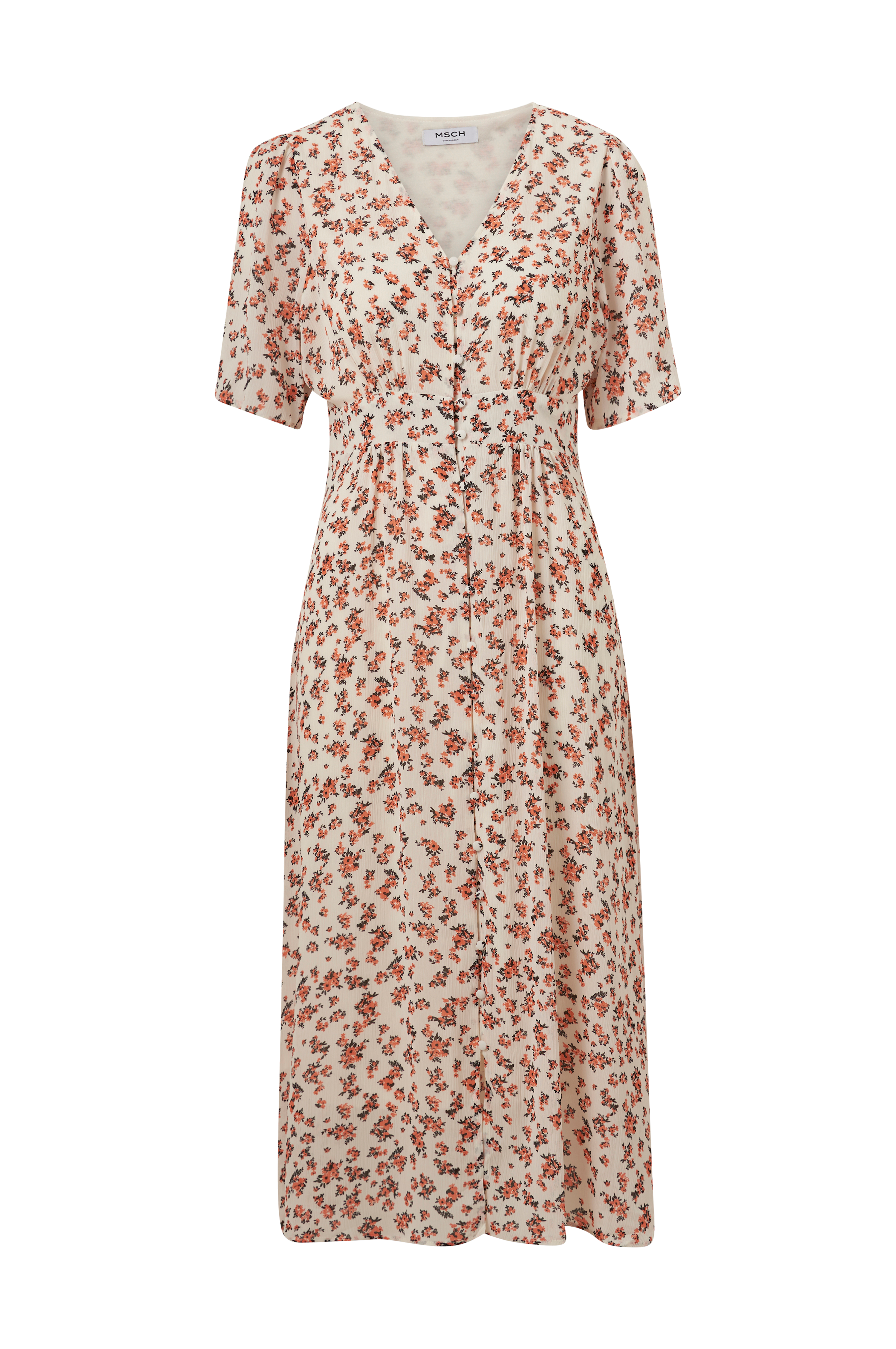 • Kjole i chiffon• V-hals snitt• Knapper foran• Korte ermer• Trikotfôr• Lengde: 120 cm i størrelse S• Produktet inneholder gjenvunnet materiale som er brukt for å redusere mengden avfall, samtidig som det ikke er brukt nye ressurser.