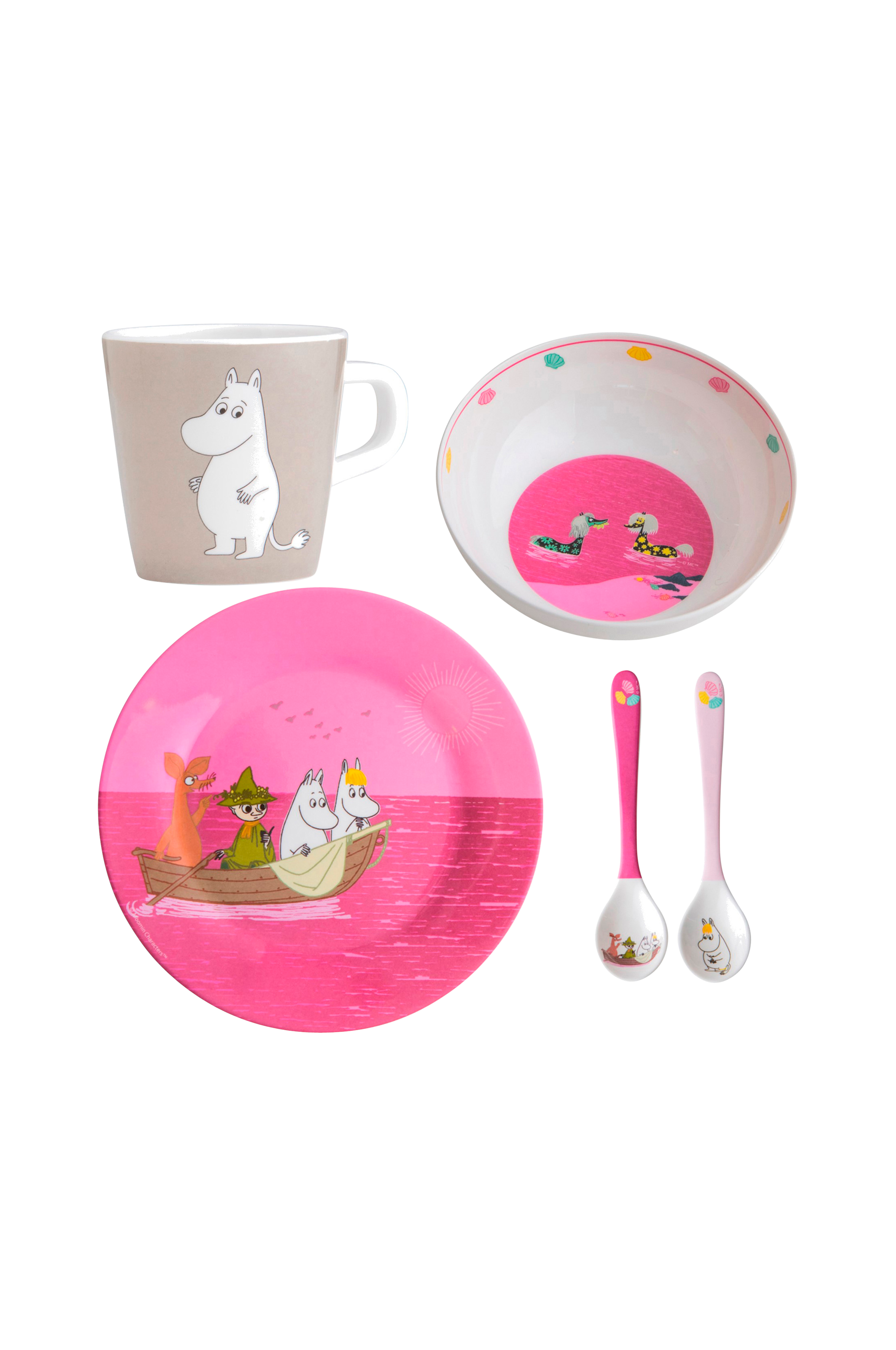 Fint babysett som inneholder Mummi -tallerken «Hav» rosa, Mummi-skål «Hav» rosa, Mateskje 2-pk (Hav) og Mummi-krus med håndtak «Vann & Bad», grå.