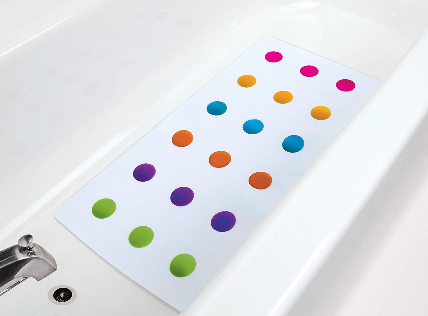 Superfin badematte med morsomme prikker i glade farger.Sugekopper gir teppet godt feste, samtidig som den også er enkel å ta bort om ønskelig.Mål: 77,5x36 cm.